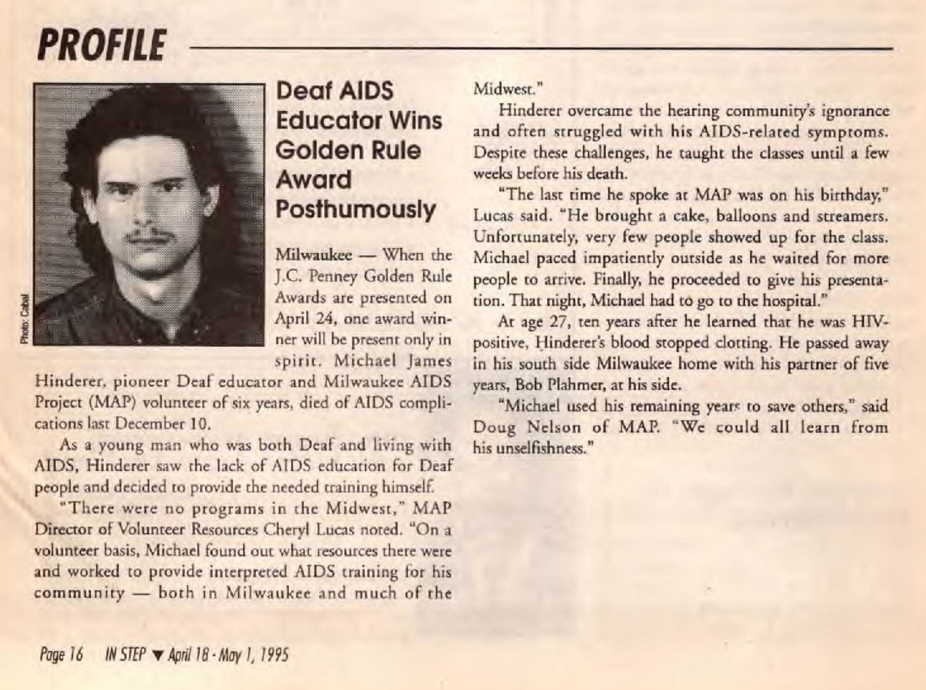 Michael Hinderer was a pioneer in AIDS prevention education in Wisconsin's Deaf community. Michael was born and grew up in Chicago. He attended the Illinois School for the Deaf and then Gallaudet University in Washington, DC. He moved to Milwaukee in the summer of 1990. Michael learned he was HIV-positive at age 17 during his first semester at Gallaudet. In recent years, he worked with the Milwaukee AIDS Project (MAP) and other groups, organizing AIDS prevention outreach to the Deaf community. He was featured in an ad for the BESTD Clinic, encouraging deaf people to get tested for HIV. "If there was a group that wanted to hear about AIDS and they had hearing-impaired people, Michael was there," MAP Prevention Educator Laura Lutz recalled. "Michael was driven," his case manager at MAP, Sarah Berg, commented. "He dedicated years to making sure the Deaf community knew what was going on with HIV/AIDS." "He was also enormously supportive of people in the Deaf community who were HIV-positive, teaching them to question doctors and caregivers, urging them to stand up for what they needed." "With Michael's death, there is a huge void," said Berg. "We really need someone to carry on, someone who has sign language ability and his knowledge of the Deaf community and HIV /AIDS." Michael passed away from AIDS-related complications at his south side Milwaukee home Sunday, December 10. He was 27. With him were his partner of five years, Bob Plahmer, and their dog, PJ. When the J.C. Penney Golden Rule Awards were presented on April 24, 1996 one award winner, Michael, was present only in spirit. According to an article about the award: As a young man who was both Deaf and living with AIDS, Hinderer saw the lack of AIDS education for Deaf people and decided to provide the needed training himself "There were no programs in the Midwest," MAP Director of Volunteer Resources Cheryl Lucas noted. "On a volunteer basis, Michael found out what resources there were and worked to provide interpreted AIDS training for his community-- both in Milwaukee and much of the Midwest." Hinderer overcame the hearing community's ignorance and often struggled with his AIDS-related symptoms. Despite these challenges, he taught the classes until a few weeks before his death. "The last time he spoke at MAP was on his birthday;" Lucas said. "He brought a cake, balloons and streamers. Unfortunately, very few people showed up for the class. Michael paced impatiently outside as he waited for more people to arrive. Finally, he proceeded to give his presentation. That night, Michael had to go to the hospital." "Michael used his remaining years to save others," said Doug Nelson of MAP. "We could all learn from his unselfishness."