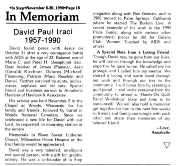 David was a very talented, intelligent and special person, with a gift for graphic artistry. He was a co-founder of In Step magazine (along with Ron Geiman). Late examples of his work included the 1990 Pride Guide, along with various other promotional pieces he did for Galano Club.