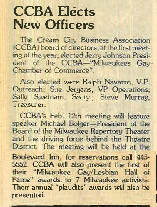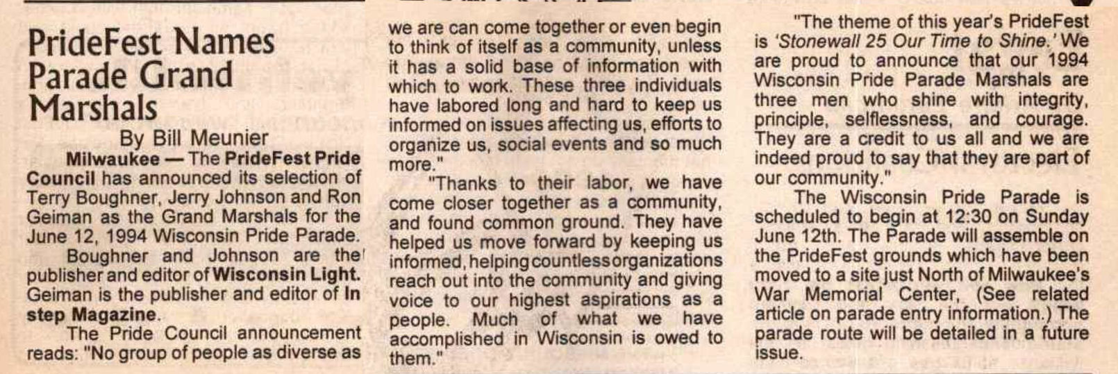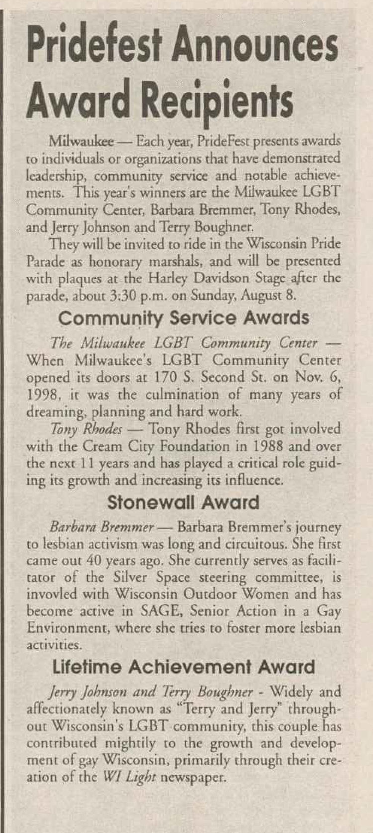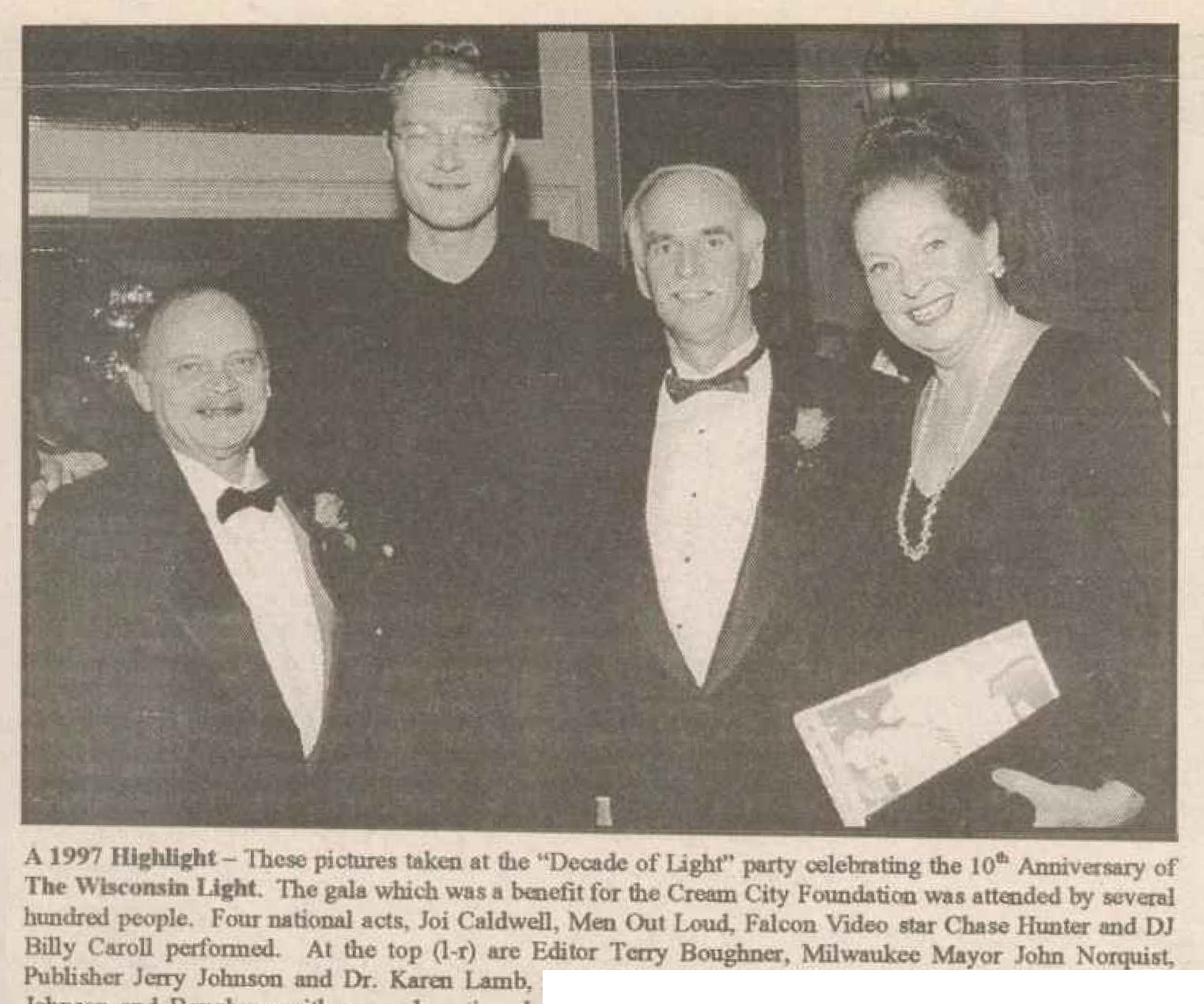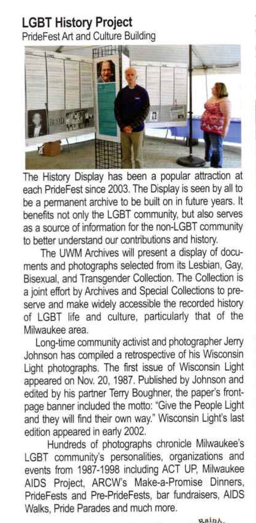 Jerry Johnson has become a well-known person in Milwaukee and Wisconsin’s GLBT community. Jerry Johnson began his involvement with the community in the 1970s, working first in the Gay Peoples Union. He became more heavily involved with the Cream City Business Association, being a member from the early 1980’s to its demise in 1989. He served on the CCBA's board of directors for several years, including as the organization’s president for two terms in 1986 and 1987. During this period Jerry graduated from the 1985-1986 class of Future Milwaukee. Jerry was on the grass roots committee that produced the pride parade in 1989. The Wisconsin Light and partnership with Terry Boughner On July 3, 1986 Terry Boughner, Ph.D. moved from Pittsburgh, PA to Milwaukee to become Jerry’s significant other. They had corresponded for 18 months after Terry replied to a personal ad Jerry ran in the Advocate magazine, seeking a lifetime significant other. With Terry’s accomplished writing skills, the two men founded the GLBT newspaper, The Wisconsin Light, in November 1987. Terry was the editor and wrote a major portion of The Light. Jerry was the newspaper’s publisher and photographer. The Light survived for eleven years on a shoe-string budget until it was sold to Greg Quindel in 1998. Two years later, Quindel ceased The Light’s publication. Jerry revived The Light briefly in 2001, but with insufficient ad revenue it lasted only six months. On May 8, 1993 Madison’s Frontiers Gay/Bi Men’s Outreach organization awarded Terry and Jerry the Professional Service Award “for their skillful and resolute efforts to provide the Gay community with a professional and reliable news source focusing on relevant issues for Lesbians, Gays and Bisexuals.” The major highlight of The Light’s years was the “A Decade of Light” tenth anniversary, three-day gala held from November 7 through 9, 1997. On November 9 one hundred attended a $100 a plate sit-down dinner in Milwaukee’s downtown Hilton hotel. Later that evening several hundred attended a celebration/dance in the hotel’s ballroom. Local and national acts from as far away as California and New York entertained. It still ranks as the greatest GLGBT party ever held in Wisconsin. Jerry donated the event’s nearly $10,000 profit to the Cream City Foundation. To commemorate the tenth anniversary The Light published a special 120 page, three section edition which reprised the previous ten years. Tenth anniversary commemorative mugs were also distributed. Other accomplishments In 1991 Milwaukee Mayor John Norquist phoned Jerry and asked him to become a founding member of the city’s Fair Housing and Employment Commission (later called the Equal Rights Commission). Mayor Norquist told Jerry that he wanted a Gay person to serve on the commission. Jerry agreed and served three terms of three years each from 1991-2000. Jerry was the recipient of at least two notable GLBT community awards. The first was being selected to be a co-grand marshal (along with Ron Geiman) for PrideFest’s 1994 annual parade. The second was PrideFest awarding Jerry a lifetime achievement award on August 8, 1999, acknowledging Jerry’s hundreds of hours of volunteer work for Milwaukee’s GLBT community. Jerry was a founding member of Milwaukee’s LGBT History Project, Inc. that was founded in 2002. Annually, the History Project has had large displays in a building at PrideFest at the Mayor Henry Maier Festival Park. (Also known as the Summerfest grounds). For six years, Jerry organized, mounted, and displayed thousands of Milwaukee/Wisconsin GLBT items from his vast GLBT collection. In 2006 alone, Jerry exhibited over 2,000 flyers, buttons, programs, posters, photos, t-shirts and other items. The display subject was “GLBT Milwaukee Entertainment” covering the mid-1970’s to 2006. Late in 2006, Jerry donated his GLBT collection to The University of Wisconsin-Milwaukee’s Golda Meir library’s GLBT archive (first making them available to the Milwaukee LGBT History Project for scanning for this web site). This archive, which was founded by the LGBT History Project, is open to the public. Jerry also donated hundreds of Wisconsin print publications to the UWM Library’s special collection department. From September 2003 to 2006 Jerry was a board member of the Cream City Foundation. In January 2007, Jerry's long-time partner, Terry Boughner, passed away. But Jerry continues to give of himself. For example, he still participates in planning the annual History display at PrideFest, and continues to collect original Hollywood movie poster one-sheets from films that had GLBT themes and/or characters. The collection of over 500 posters ranks among the two or three best in the United States. Jerry intends to donate this collection to the UWM Special Collections archive at some point. Early Years, and non-LGBT accomplishments Jerry moved to Milwaukee from Pewaukee in 1973 in order to live with his significant other, Steven Walther. Jerry and Steve were together for four years until Steve passed away on September 14, 1977 from a brain tumor. Prior to moving to Milwaukee, Jerry attended Milton College in Milton, WI; served in the Peace Corps in Owo, Nigeria from 1966-1968 and operated/owned the Lake Movie Theatre in Pewaukee from 1969-1974. While there, he won the 1969 “Showmanship” Award from the trade magazine, Box-Office and the “Showman of the Year” Award from the National Association of Theatre Owners of Wisconsin/upper Michigan. From 1977 to 1983 Jerry worked at Gimbel’s in the purchasing department. In December 1982, he won the department store’s “Merchant of the Month” award. Jerry bought his long-time residence on North Palmer Street in 1980 in a run-down neighborhood now known as Brewers’ Hill. The asking price was $1,000. Jerry paid $750. The following year on April 26 he founded the Historic Brewers’ Hill Neighborhood Association with the first two m