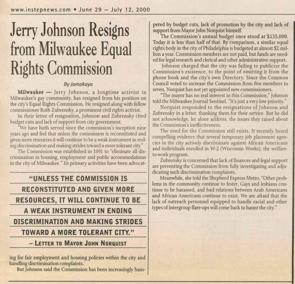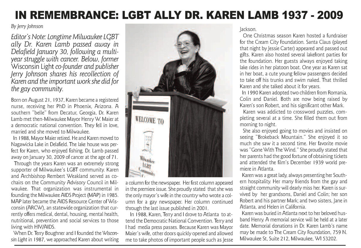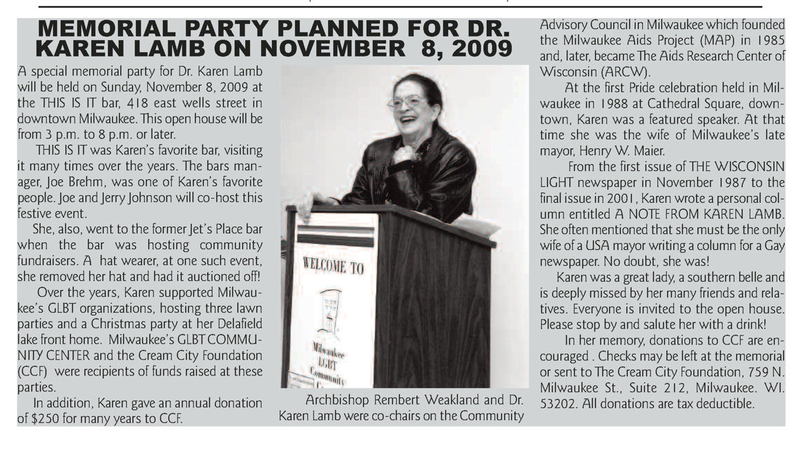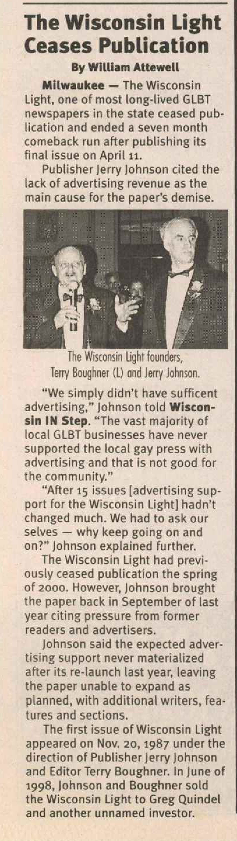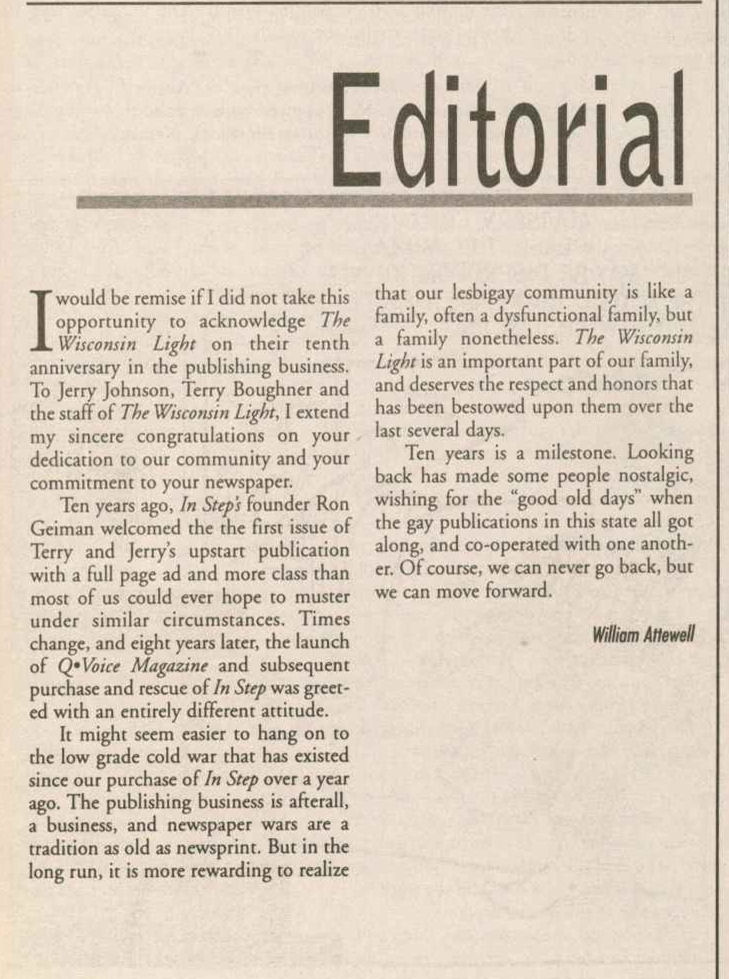 Jerry Johnson has become a well-known person in Milwaukee and Wisconsin’s GLBT community. Jerry Johnson began his involvement with the community in the 1970s, working first in the Gay Peoples Union. He became more heavily involved with the Cream City Business Association, being a member from the early 1980’s to its demise in 1989. He served on the CCBA's board of directors for several years, including as the organization’s president for two terms in 1986 and 1987. During this period Jerry graduated from the 1985-1986 class of Future Milwaukee. Jerry was on the grass roots committee that produced the pride parade in 1989. The Wisconsin Light and partnership with Terry Boughner On July 3, 1986 Terry Boughner, Ph.D. moved from Pittsburgh, PA to Milwaukee to become Jerry’s significant other. They had corresponded for 18 months after Terry replied to a personal ad Jerry ran in the Advocate magazine, seeking a lifetime significant other. With Terry’s accomplished writing skills, the two men founded the GLBT newspaper, The Wisconsin Light, in November 1987. Terry was the editor and wrote a major portion of The Light. Jerry was the newspaper’s publisher and photographer. The Light survived for eleven years on a shoe-string budget until it was sold to Greg Quindel in 1998. Two years later, Quindel ceased The Light’s publication. Jerry revived The Light briefly in 2001, but with insufficient ad revenue it lasted only six months. On May 8, 1993 Madison’s Frontiers Gay/Bi Men’s Outreach organization awarded Terry and Jerry the Professional Service Award “for their skillful and resolute efforts to provide the Gay community with a professional and reliable news source focusing on relevant issues for Lesbians, Gays and Bisexuals.” The major highlight of The Light’s years was the “A Decade of Light” tenth anniversary, three-day gala held from November 7 through 9, 1997. On November 9 one hundred attended a $100 a plate sit-down dinner in Milwaukee’s downtown Hilton hotel. Later that evening several hundred attended a celebration/dance in the hotel’s ballroom. Local and national acts from as far away as California and New York entertained. It still ranks as the greatest GLGBT party ever held in Wisconsin. Jerry donated the event’s nearly $10,000 profit to the Cream City Foundation. To commemorate the tenth anniversary The Light published a special 120 page, three section edition which reprised the previous ten years. Tenth anniversary commemorative mugs were also distributed. Other accomplishments In 1991 Milwaukee Mayor John Norquist phoned Jerry and asked him to become a founding member of the city’s Fair Housing and Employment Commission (later called the Equal Rights Commission). Mayor Norquist told Jerry that he wanted a Gay person to serve on the commission. Jerry agreed and served three terms of three years each from 1991-2000. Jerry was the recipient of at least two notable GLBT community awards. The first was being selected to be a co-grand marshal (along with Ron Geiman) for PrideFest’s 1994 annual parade. The second was PrideFest awarding Jerry a lifetime achievement award on August 8, 1999, acknowledging Jerry’s hundreds of hours of volunteer work for Milwaukee’s GLBT community. Jerry was a founding member of Milwaukee’s LGBT History Project, Inc. that was founded in 2002. Annually, the History Project has had large displays in a building at PrideFest at the Mayor Henry Maier Festival Park. (Also known as the Summerfest grounds). For six years, Jerry organized, mounted, and displayed thousands of Milwaukee/Wisconsin GLBT items from his vast GLBT collection. In 2006 alone, Jerry exhibited over 2,000 flyers, buttons, programs, posters, photos, t-shirts and other items. The display subject was “GLBT Milwaukee Entertainment” covering the mid-1970’s to 2006. Late in 2006, Jerry donated his GLBT collection to The University of Wisconsin-Milwaukee’s Golda Meir library’s GLBT archive (first making them available to the Milwaukee LGBT History Project for scanning for this web site). This archive, which was founded by the LGBT History Project, is open to the public. Jerry also donated hundreds of Wisconsin print publications to the UWM Library’s special collection department. From September 2003 to 2006 Jerry was a board member of the Cream City Foundation. In January 2007, Jerry's long-time partner, Terry Boughner, passed away. But Jerry continues to give of himself. For example, he still participates in planning the annual History display at PrideFest, and continues to collect original Hollywood movie poster one-sheets from films that had GLBT themes and/or characters. The collection of over 500 posters ranks among the two or three best in the United States. Jerry intends to donate this collection to the UWM Special Collections archive at some point. Early Years, and non-LGBT accomplishments Jerry moved to Milwaukee from Pewaukee in 1973 in order to live with his significant other, Steven Walther. Jerry and Steve were together for four years until Steve passed away on September 14, 1977 from a brain tumor. Prior to moving to Milwaukee, Jerry attended Milton College in Milton, WI; served in the Peace Corps in Owo, Nigeria from 1966-1968 and operated/owned the Lake Movie Theatre in Pewaukee from 1969-1974. While there, he won the 1969 “Showmanship” Award from the trade magazine, Box-Office and the “Showman of the Year” Award from the National Association of Theatre Owners of Wisconsin/upper Michigan. From 1977 to 1983 Jerry worked at Gimbel’s in the purchasing department. In December 1982, he won the department store’s “Merchant of the Month” award. Jerry bought his long-time residence on North Palmer Street in 1980 in a run-down neighborhood now known as Brewers’ Hill. The asking price was $1,000. Jerry paid $750. The following year on April 26 he founded the Historic Brewers’ Hill Neighborhood Association with the first two m