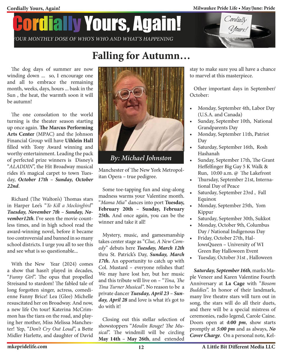 Michael Johnston is widely known to Wisconsinites as 'Karen Valentine', or simply 'KV, in his frequent drag persona. Customers of the M&M Club bar (1976-2006) know that bar was where KV felt most at home early on. There he met 'Rona' (Ron Thate) and other life-long friends, and opened himself up to doing performances in drag or at the piano. When that bar closed, he moved on to Boom/ The Room bar (2004-2014). KV became more known state-wide when he began writing the social-events column 'Cordially Your' for 'In Step' magazine around 1999. That column has moved around as LGBTQ peridoicals in the state came and went, but he continues to write the column, which currently appears in the monthly online magazine 'Milwaukeee Pride Life'. Michael has long been a lover of the arts and culture. He joined the local gay choral group Fest City Singers in 1985, and that's when he discovered his 'Karen Valentine' alter ego for performance in drag. (He had acquired the KV nickname a few years earlier, hanging out at the M&M Club- but then it was just a nickname.) Over time, Michael embraced the broader need to endow meaningful causes with needed funding-- and used his KV persona and reknown to establish the 'Karen Valentine Fund for the Arts, Culture and the Humanities', a funding program within the Cream City Foundation, the area's LGBTQ charitable foundation. He prefers acting as MC at events more than singing performances, and gives generously of his time. The following biography of 'KV' was created from an interview of Michael Johnston done by Diane Gregory of this History Project in November 2023: Michael grew up in West Allis and attended West Allis Central High School. "It was not an easy upbringing for me," said Michael. "My childhood was very lonely and friendless. I never felt I truly belonged. I grew up with four brothers: three older, one younger. They were all into sports, hunting, and fishing-- and very good at them-- but those things were foreign to me. I escaped into soap operas, old movies, the arts. I grew up across the street from the public library, where I read every Life and Look magazine from the 1930s to the 1970s. My mind became a sponge. The library provided an escape where I could explore my fantasies. I wanted to grow up and move to New York City. As Mother put it, you're not the best looking one, so be the most fascinating one." "I got along well with my teachers, but not my classmates," said Michael. "I was never invited to parties or social activities. I was too old of a soul. My grandmother always had time for me. That nourished my fascination with the past. Music was Rodgers & Hart, Irving Berlin, the Gershwins." Later, he attended MATC, UW-Milwaukee, and MIAD while pursuing studies in communications, marketing, and art. "The swan in me emerged at age 18," said Michael. "I have always craved security. The chorus became a community for me. And the M&M Club became a place where I felt like I truly belonged." Michael has worked for the Advocate Aurora Health Foundations since 2005. "Working as a fundraiser for a foundation is like a parallel world," said Michael. "But I try to keep everything in its proper place in my professional life. Throughout the years, the world has opened and become far more accepting. Colleagues have attended my shows to see what I do. While working at Hamburger Mary's and This Is It, I raised money for Aurora-affiliated charities and funds. My friends, co-workers, and leaders all cheered me on. It was marvelous taking away the fear of acceptance or being outed at work. Once you accept you, it's easier for others to do so." Michael came out on Sweetest Day in October 1979 thanks to his college friends Michael and Ryan. "While I was a freshman in college, I made friends with a guy who always talked about his weekend adventures," said Michael. "He invited me to join him, but I kept saying no. Finally, I accepted his invitation and went OUT." "It was 11:00 p.m.-- a time when I would normally be coming home-- when we left the house. At that time, bars were open until 3:30 a.m. on Fridays and Saturdays, and that was before the after-bar parties, Ma Fischer's, George Webb's, bathhouses, and bookstores that never seemed to close!" "I walked into C'est La Vie and had the honor of being scoped out by John Clayton and his flashlight. I remember twenty-five cent cocktails until midnight-- no more than two per customer-- and Stephanie Mills wailing 'I Never Knew Love Like This Before.' C'est La Vie always had a colorful clientele and that night was no different. I loved their jukebox: 'Sky Pilot,' 'If I Could Read Your Mind,' 'House of the Rising Sun,' the list goes on. I saw men dancing together, chatting, kissing, hugging, it was amazing. I'm sure my eyes looked like saucers!" "From there, we visited the Phoenix, Trash, and Ball Game. It was all so much to take in-- and I was really overwhelmed. En route to M&M Club, Michael confessed that he was gay and had a lover. They thought I would be comfortable in these places. Of course, it was a baptism of fire, and my very strong curiosity led me down my own yellow brick road!" "The next stop was M&M Club, where I immediately felt at home," said Michael. "Rona was bartending, the room was dark, and there were still shutters on the windows. I felt so safe and secure there. For the next 27 years, M&M was my home bar. It reminded me of a true gentlemen's club. I liked the tie and jacket look, the live piano, the restaurant, and the shows. M&M Club was the county seat, the community center, the home base. So many memories. Friends, it was like a finishing school!" "We shared so many collective experiences back then," said Karen, "because people were not distracted by their phones. We were all living for the next big thing. Today's youth miss so many experiences simply because they're not living in the moment." When Michael joined the Fest City Singers in 1985, it opened a Pandora's Box. He discovered his alter ego Kare