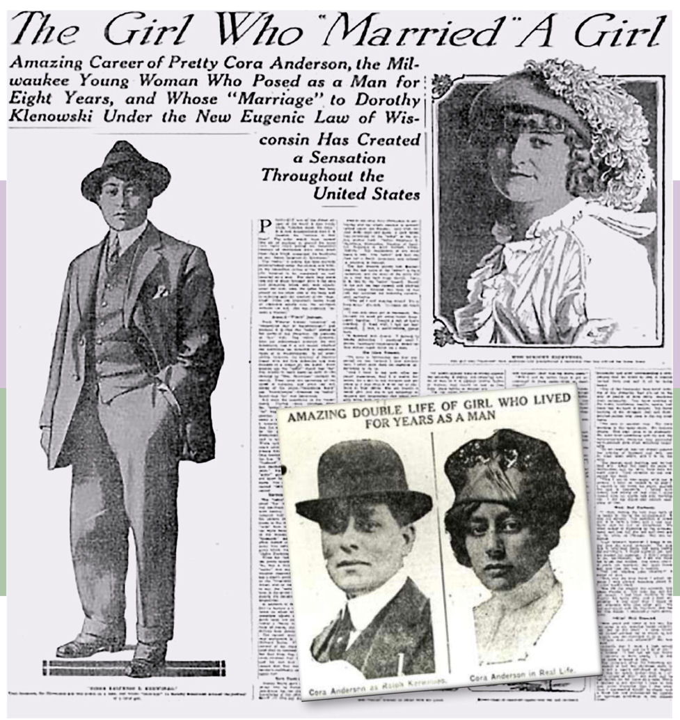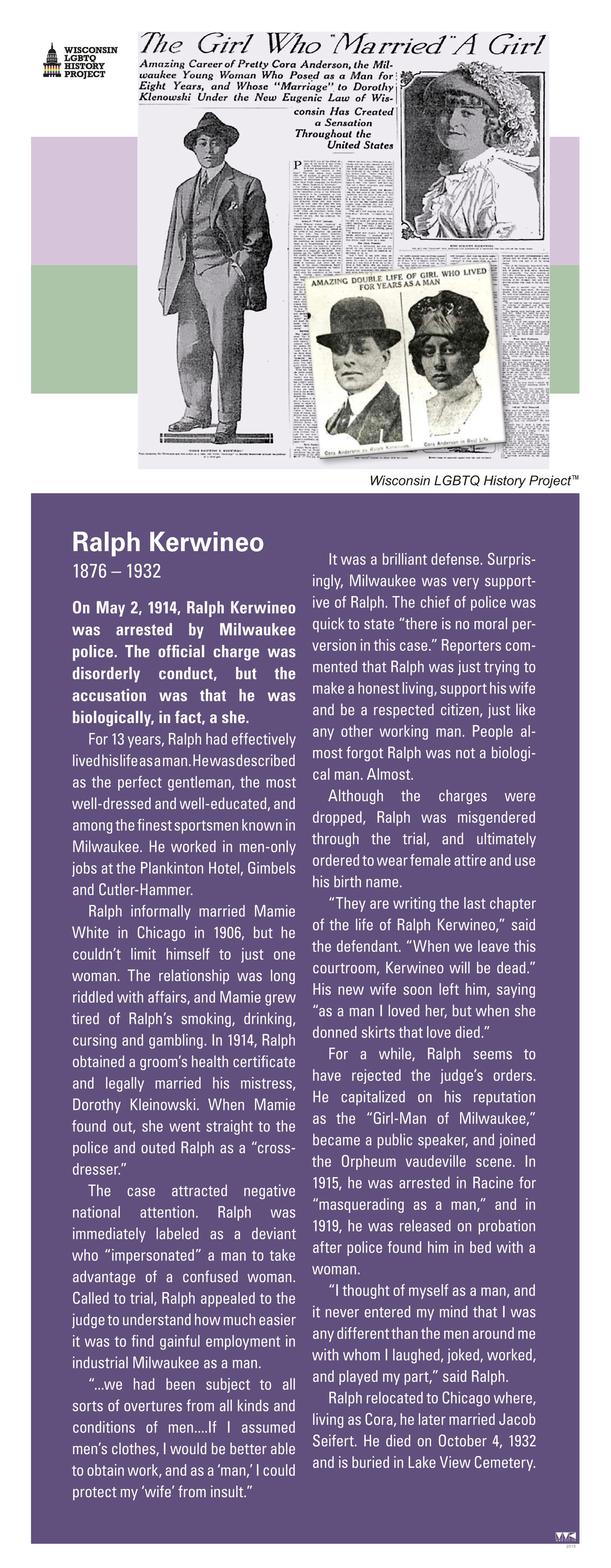 (Text and photos by Michail Takach, for an historical panel created by this project in 2019. The panel is on loan to the 'This Is It' bar in downtown Milwaukee.) On May 2, 1914, Ralph Kerwineo was arrested by Milwaukee police. The official charge was disorderly conduct, but the accusation was that he was biologically, in fact, a she. For 13 years, Ralph had effectively lived his life as a man. He was described as the perfect gentleman, the most well-dressed and well-educated, and among the finest sportsmen known in Milwaukee. He worked in men-only jobs at the Plankinton Hotel, Gimbels and Cutler-Hammer. Ralph informally married Mamie White in Chicago in 1906, but he couldn't limit himself to just one woman. The relationship was long riddled with affairs, and Mamie grew tired of Ralph's smoking, drinking, cursing and gambling. In 1914, Ralph obtained a groom's health certificate and legally married his mistress, Dorothy Kleinowski. When Mamie found out, she went straight to the police and outed Ralph as a "cross-dresser." The case attracted negative national attention. Ralph was immediately labeled as a deviant who "impersonated" a man to take advantage of a confused woman. Called to trial, Ralph appealed to the judge to understand how much easier it was to find gainful employment in industrial Milwaukee as a man. "...we had been subject to all sorts of overtures from all kinds and conditions of men....If I assumed men's clothes, I would be better able to obtain work, and as a 'man,' I could protect my 'wife' from insult." It was a brilliant defense. Surprisingly, Milwaukee was very supportive of Ralph. The chief of police was quick to state "there is no moral perversion in this case." Reporters commented that Ralph was just trying to make a honest living, support his wife and be a respected citizen, just like any other working man. People almost forgot Ralph was not a biological man. Almost. Although the charges were dropped, Ralph was misgendered through the trial, and ultimately ordered to wear female attire and use his birth name. "They are writing the last chapter of the life of Ralph Kerwineo," said the defendant. "When we leave this courtroom, Kerwineo will be dead." His new wife soon left him, saying "as a man I loved her, but when she donned skirts that love died." For a while, Ralph seems to have rejected the judge's orders. He capitalized on his reputation as the "Girl-Man of Milwaukee," became a public speaker, and joined the Orpheum vaudeville scene. In 1915, he was arrested in Racine for "masquerading as a man," and in 1919, he was released on probation after police found him in bed with a woman. "I thought of myself as a man, and it never entered my mind that I was any different than the men around me with whom I laughed, joked, worked, and played my part," said Ralph. Ralph relocated to Chicago where, living as Cora Anderson, he later married Jacob Seifert. He died on October 4, 1932 and is buried in Lake View Cemetery. |