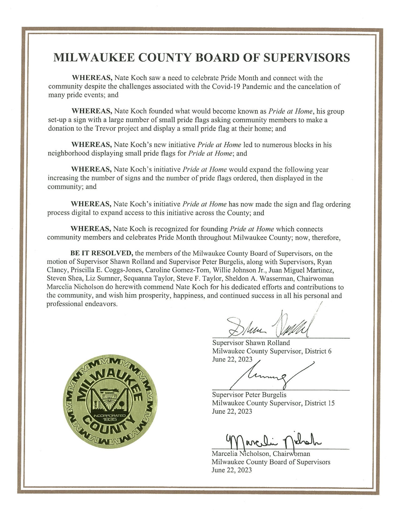 - BE IT RESOLVED, the members of the Milwaukee County Board of Supervisors, on the motion of Supervisor Shawn Rolland and Supervisor Peter Burgelis, along with Supervisors, Ryan Clancy, Priscilla E. Coggs-Jones, Caroline Gomez-Tom, Willie Johnson Jr., Juan Miguel Martinez, Steven Shea, Liz Sumner, Sequanna Taylor, Steve F. Taylor, Sheldon A. Wasserman, Chairwoman Marcelia Nicholson do herewith commend Nate Koch for his dedicated efforts and contributions to the community, and wish him prosperity, happiness, and continued success in all his personal and professional endeavors.
