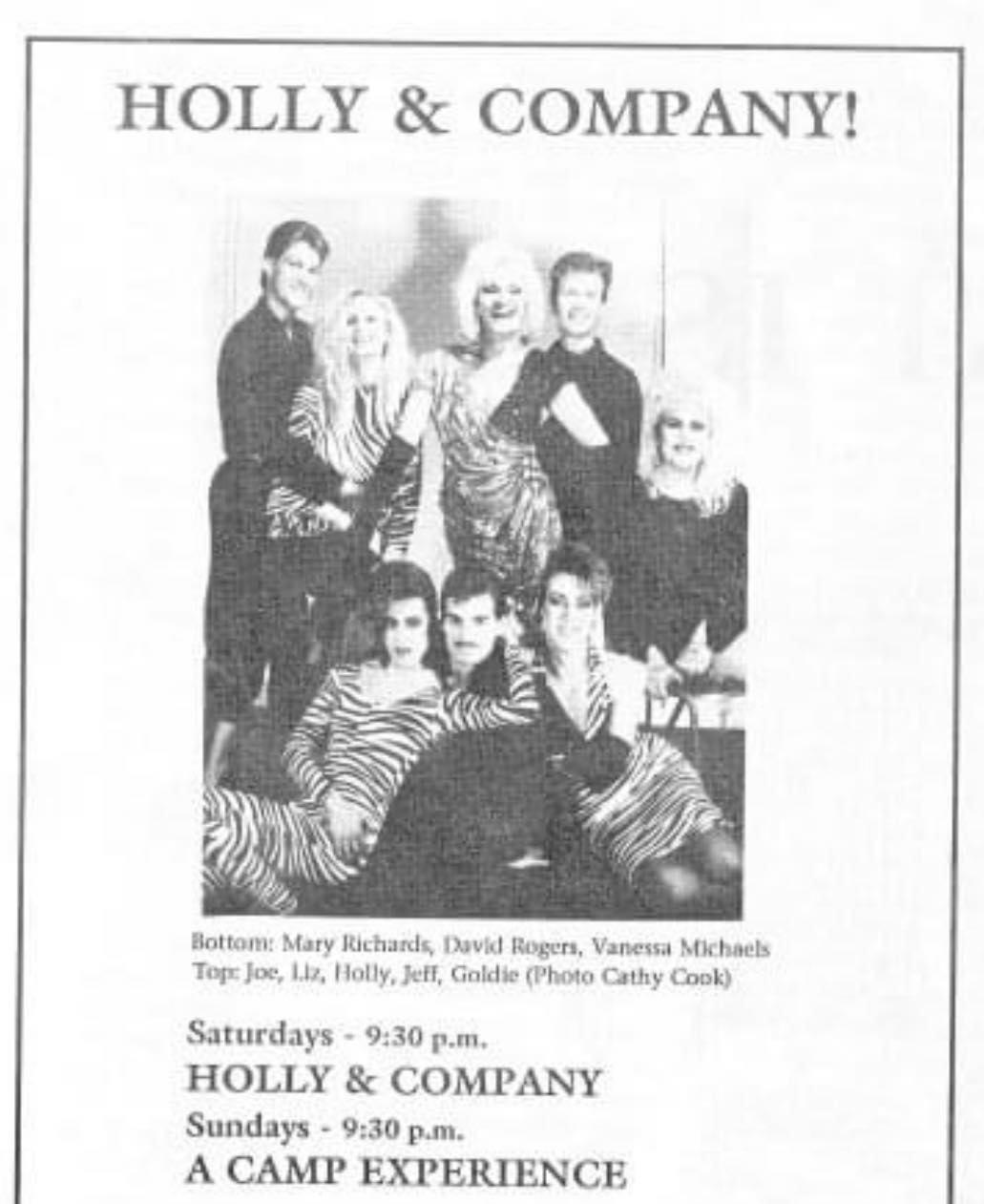 "What a great time in my life I was having with Holly & Company," said David. "I was able to work with legends including Mimi Marks, Ginger Spice, Candi Stratton, Vanessa Alexander, B.J. Daniels… the list is endless. We had a blast whenever we performed. As much fun as it was to put on the cabaret show, twice a week at La Cage, it was also a lot of work. We were our own stage and lighting hands, putting the stage together and then taking it down right afterwards, so that DJ Tonya could use the space for Dance, Dance, dance. We 'adopted' Jackie Roberts, Sasha Mitchell, and Rudi D'Angelo to operate the spotlight when they were young and just coming out. When a cast member needed an extra back-up dancer, we often grabbed one of them to get on stage, leaving us without a light person. Those three would go on to become top performers and legends."