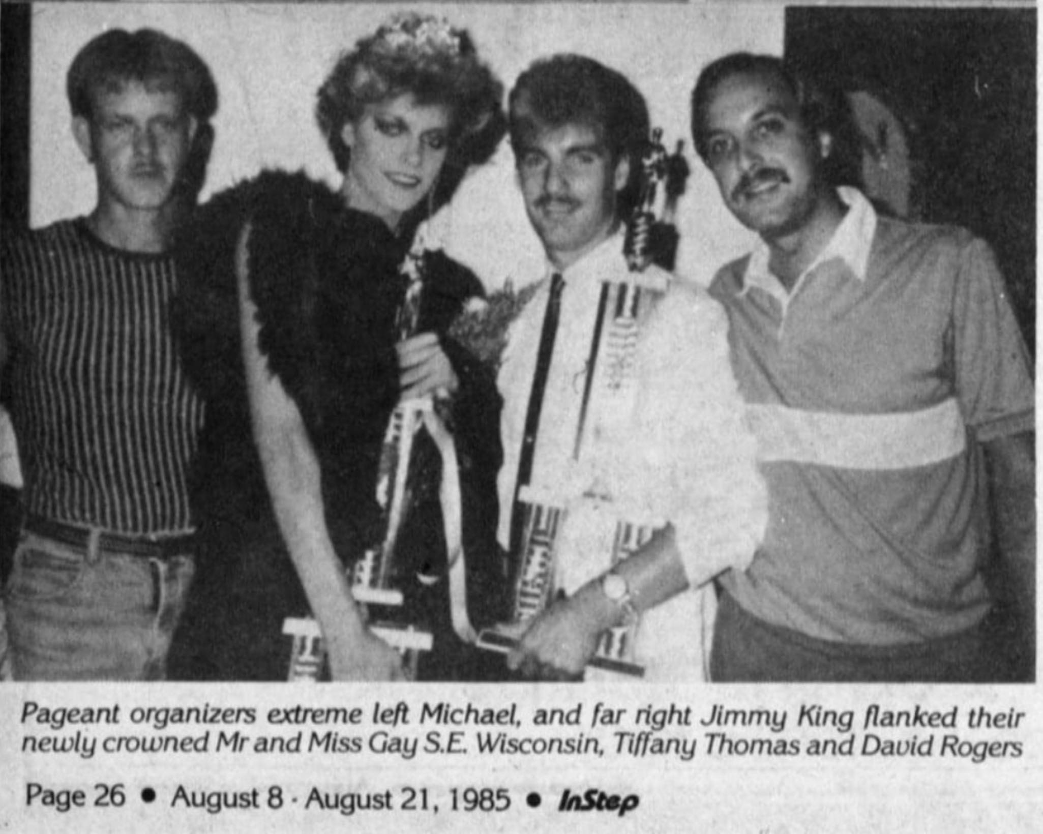 David got involved with Jimmy King Productions, which produced traveling shows throughout Wisconsin. The pageant business was growing in the mid-eighties, and David was a popular contestant. His first win was Mr. Your Place, then Mr. Southeast Wisconsin (with Tiffany Thomas,) and Mr. Fox Valley (with Mandi McCall.) To enter the Mr. and Miss Gay Wisconsin Pageant, you needed a bar title. So, David – as Mr. YP – entered in 1986 and won Mr. Gay Wisconsin (with Erica Stevens.)