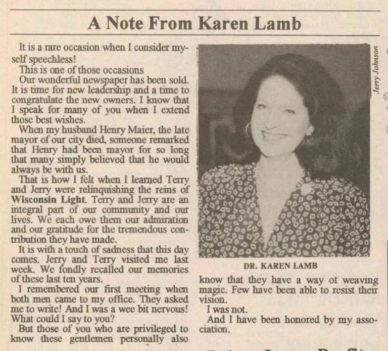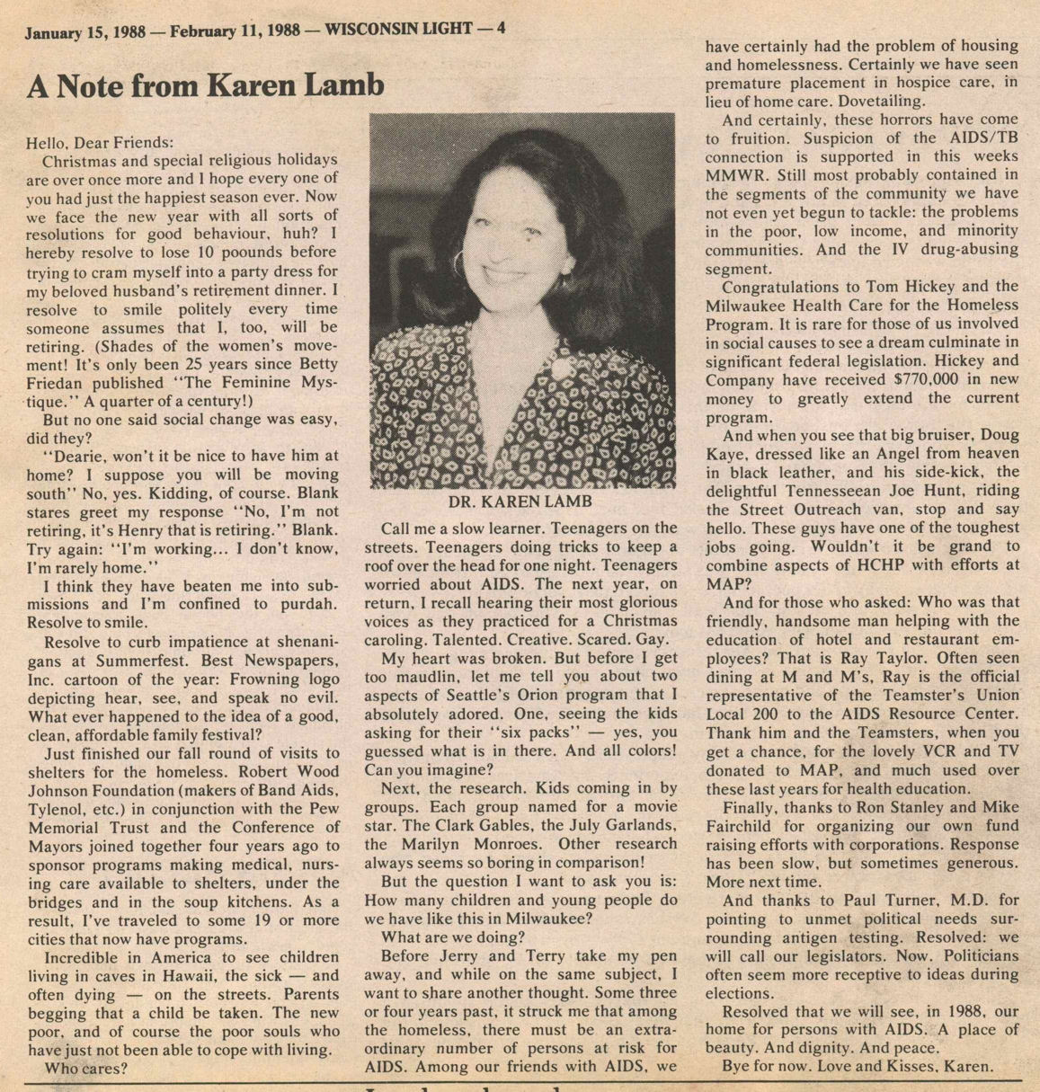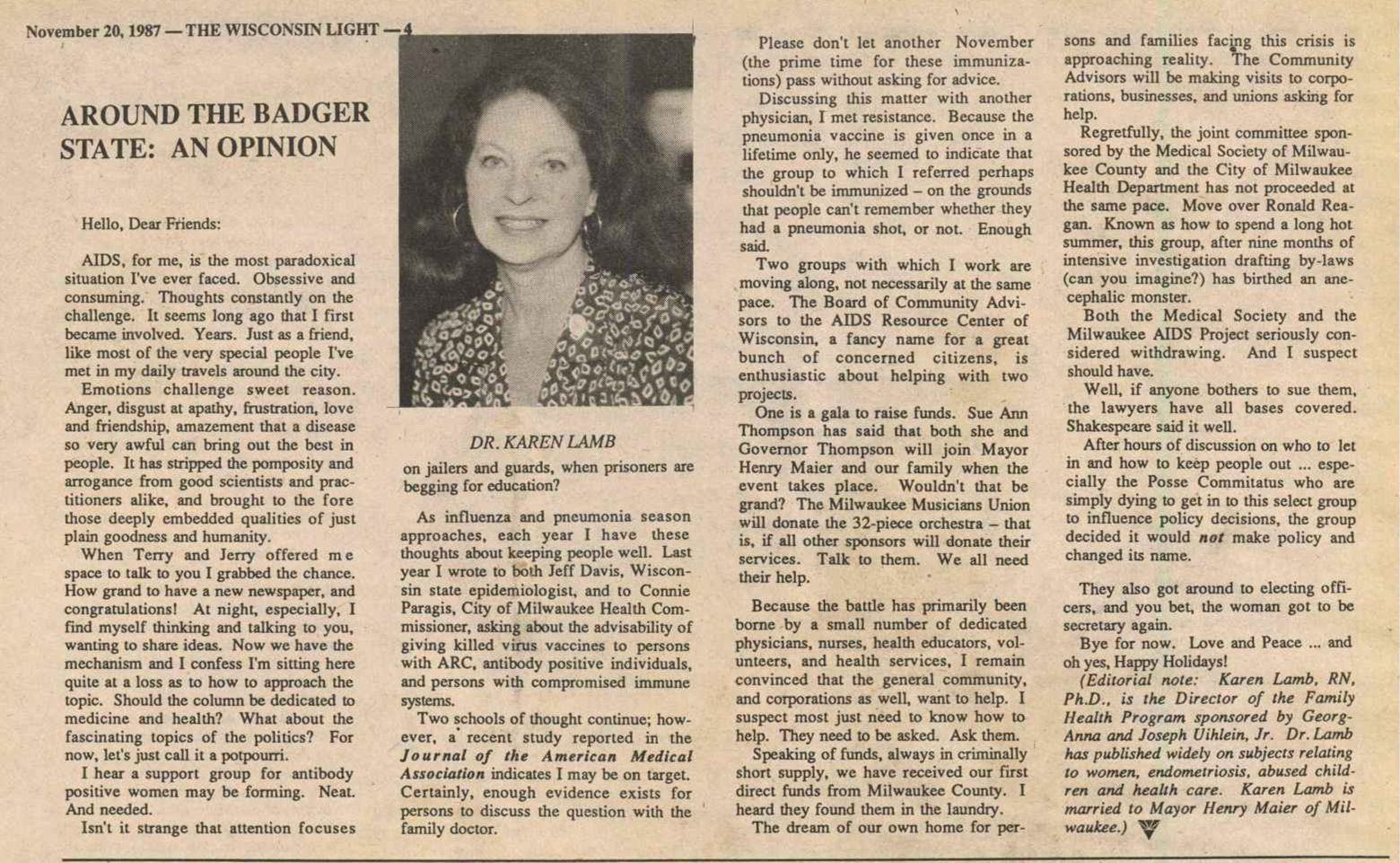 Karen Lamb was the wife of long-time mayor of Milwaukee, Henry Maier, but in the LGBT community is best known as a consistent supporter of the community and its causes, primarily in the areas of health and equality. She made headlines when she became a columnist for The Wisconsin Light, a Milwaukee-based newspaper geared to the gay and lesbian community. Her obituary was written by Emily Bultman for "GM Today" on Feb 6, 2009, Updated Jan 24, 2020 reads as follows: Former Milwaukee mayor's wife leaves legacy of her own Former Milwaukee Mayor Henry W. Maier was not the only member of his family who left behind a legacy following death: His widow, Karen Lamb, who passed away Jan. 30, created a name for herself as a community activist known for her Southern hospitality. "Karen was a Southern belle from Georgia. She exuded Southern hospitality and was friendly to everyone she met," her friend, Jerry Johnson, said. "I will cherish the times I went out to her house to spend the day with her. We would go shopping, eat lunch or plant vegetables in her garden. She was definitely my best friend." Lamb, 71, died at her Delafield home on Nagawicka Lake after battling cancer, Johnson said. Lamb met Maier in 1974 at the National Democratic Charter Convention and the couple married two years later. Maier, who served as Milwaukee mayor from 1960 to 1988, died of pneumonia at their home in 1994 at age 76. Johnson said the couple always dreamed of owning a house on a lake. "Karen's son, Robert, found the house while Henry and her were on vacation and he bought it before they saw it," Johnson said. "She loved fishing and living on the lake." A registered nurse who held a doctorate degree in medical sociology, Lamb was a consistent supporter of lesbian, gay, bisexual and transgender communities and their causes. Lamb was co-chairwoman of the Community Advisory Council, which started the AIDS Resource Center of Wisconsin. "Her leadership in the mid-1980s gave instant credibility to the fight against AIDS in Milwaukee," said AIDS Resource Center of Wisconsin President and CEO Doug Nelson. "She never gave up this cause." Johnson said he encouraged Lamb to write a column for the Wisconsin Light, the first Milwaukee-based gay and lesbian newspaper. "Karen was proud she was the only mayor's wife in the country who wrote for a gay newspaper," said Johnson, who founded the publication with Terry Boughner. "She wrote her column until the last issue." Lamb attended and later hosted several lakefront parties at her home for the Cream City Foundation, at which her guests always enjoyed taking lake rides in the pontoon boat. "The Cream City Foundation is committed to the LGBT community, and Karen was a strong ally and strong voice for us," said Cream City Foundation Executive Director Maria Cadenas. Joe Brehm remembers the many conversations he had with Lamb at his gay bar, This Is It, in downtown Milwaukee. "Karen will be missed. She was a benefactor for so many people," Brehm said. "She stood up for people and never backed down from what she believed in." Lamb was buried in Atlanta, next to her husband. Her obituary in the local Milwaukee Journal-Sentinel 'Online' can be read here. Additional facts about Dr. Lamb as derived from that obituary: "Lamb grew up on the family farm in Decatur, Ga., near Atlanta. She became a public health nurse in rural Georgia, later earning her doctorate in medical sociology." "Both Lamb and Maier were divorced - she was a working mother raising a son - when the two met in 1974 at the National Democratic Charter Convention. She heard Maier speak at an urban policy forum and was impressed."... "The two married in 1976." After her marriage to Henry Maier, she "quietly and matter-of-factly declined to change her name. She continued to pursue her own professional interests in her new city, including research on child abuse as an associate professor at the Medical College of Wisconsin, and research analyst at Milwaukee Area Technical College." "They were both political and strong-willed and, as Lamb later said, proved that it is not necessarily opposites who are attracted to each other... She pursued her political interests and causes, too, including advocacy for the Equal Rights Amendment and gay rights." "Lamb's community involvement came to include health and social issues related to AIDS. The epidemic hit home with a call from a friend who had discovered that he had the disease... That was in 1983... In 1985, activist Lamb and then-Archbishop Rembert Weakland became co-chairpersons of the forerunner of what is now the AIDS Resource Center of Wisconsin." |