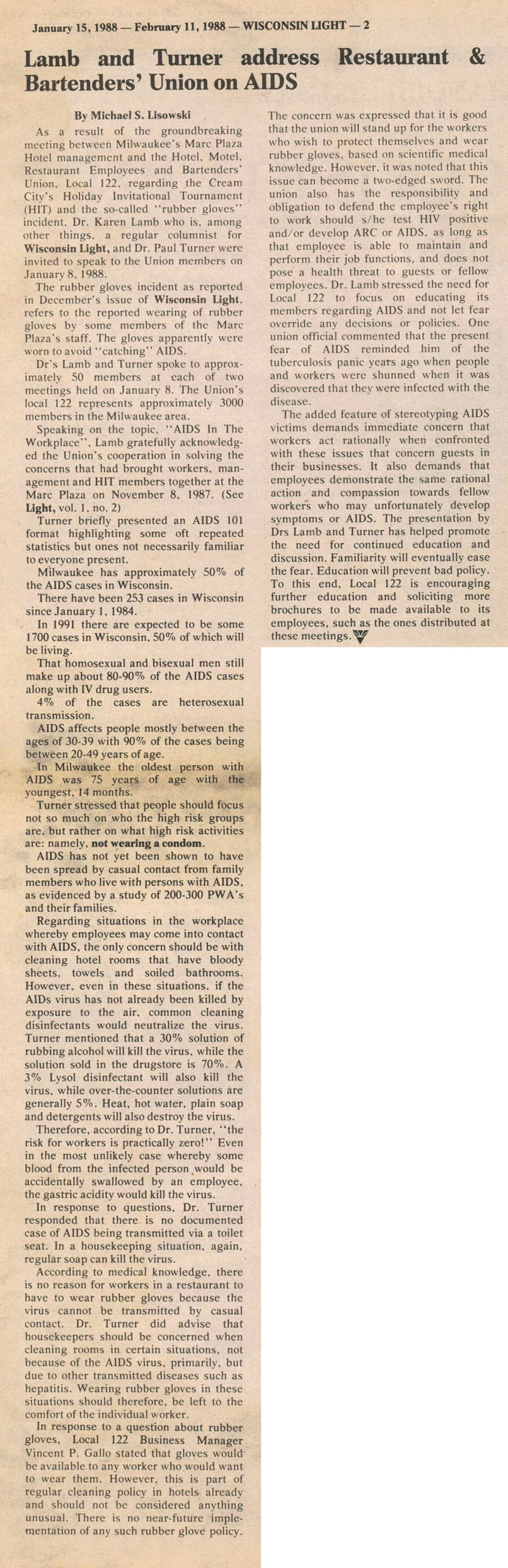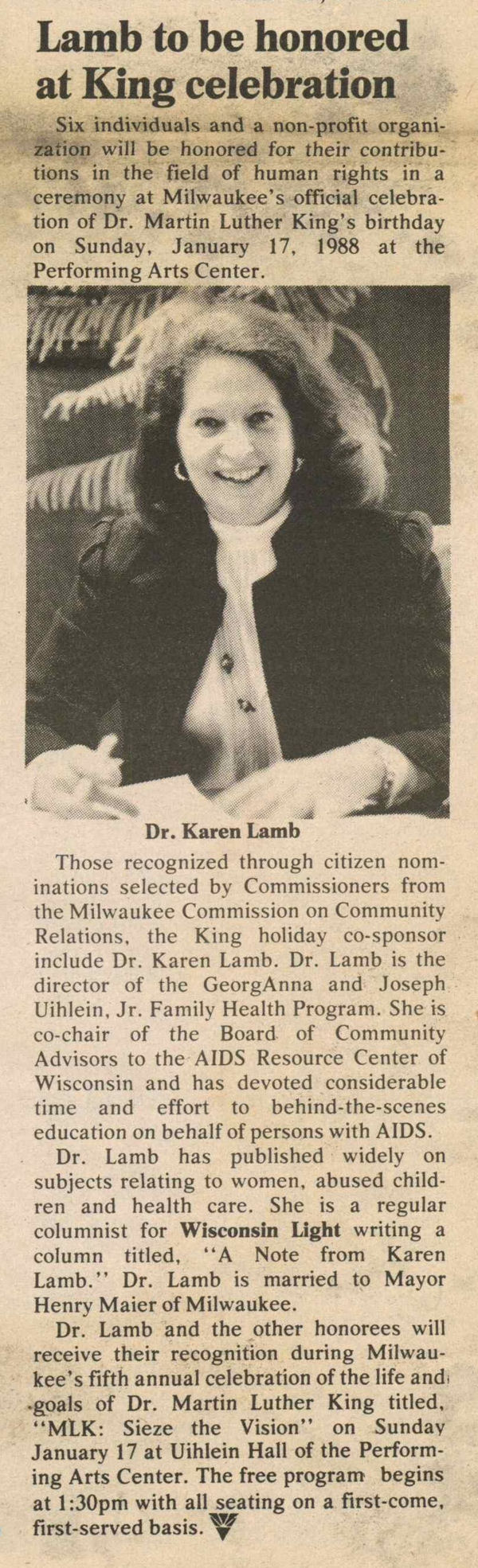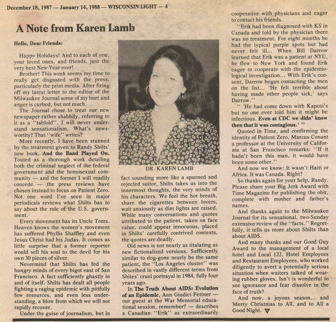 Karen Lamb was the wife of long-time mayor of Milwaukee, Henry Maier, but in the LGBT community is best known as a consistent supporter of the community and its causes, primarily in the areas of health and equality. She made headlines when she became a columnist for The Wisconsin Light, a Milwaukee-based newspaper geared to the gay and lesbian community. Her obituary was written by Emily Bultman for "GM Today" on Feb 6, 2009, Updated Jan 24, 2020 reads as follows: Former Milwaukee mayor's wife leaves legacy of her own Former Milwaukee Mayor Henry W. Maier was not the only member of his family who left behind a legacy following death: His widow, Karen Lamb, who passed away Jan. 30, created a name for herself as a community activist known for her Southern hospitality. "Karen was a Southern belle from Georgia. She exuded Southern hospitality and was friendly to everyone she met," her friend, Jerry Johnson, said. "I will cherish the times I went out to her house to spend the day with her. We would go shopping, eat lunch or plant vegetables in her garden. She was definitely my best friend." Lamb, 71, died at her Delafield home on Nagawicka Lake after battling cancer, Johnson said. Lamb met Maier in 1974 at the National Democratic Charter Convention and the couple married two years later. Maier, who served as Milwaukee mayor from 1960 to 1988, died of pneumonia at their home in 1994 at age 76. Johnson said the couple always dreamed of owning a house on a lake. "Karen's son, Robert, found the house while Henry and her were on vacation and he bought it before they saw it," Johnson said. "She loved fishing and living on the lake." A registered nurse who held a doctorate degree in medical sociology, Lamb was a consistent supporter of lesbian, gay, bisexual and transgender communities and their causes. Lamb was co-chairwoman of the Community Advisory Council, which started the AIDS Resource Center of Wisconsin. "Her leadership in the mid-1980s gave instant credibility to the fight against AIDS in Milwaukee," said AIDS Resource Center of Wisconsin President and CEO Doug Nelson. "She never gave up this cause." Johnson said he encouraged Lamb to write a column for the Wisconsin Light, the first Milwaukee-based gay and lesbian newspaper. "Karen was proud she was the only mayor's wife in the country who wrote for a gay newspaper," said Johnson, who founded the publication with Terry Boughner. "She wrote her column until the last issue." Lamb attended and later hosted several lakefront parties at her home for the Cream City Foundation, at which her guests always enjoyed taking lake rides in the pontoon boat. "The Cream City Foundation is committed to the LGBT community, and Karen was a strong ally and strong voice for us," said Cream City Foundation Executive Director Maria Cadenas. Joe Brehm remembers the many conversations he had with Lamb at his gay bar, This Is It, in downtown Milwaukee. "Karen will be missed. She was a benefactor for so many people," Brehm said. "She stood up for people and never backed down from what she believed in." Lamb was buried in Atlanta, next to her husband. Her obituary in the local Milwaukee Journal-Sentinel 'Online' can be read here. Additional facts about Dr. Lamb as derived from that obituary: "Lamb grew up on the family farm in Decatur, Ga., near Atlanta. She became a public health nurse in rural Georgia, later earning her doctorate in medical sociology." "Both Lamb and Maier were divorced - she was a working mother raising a son - when the two met in 1974 at the National Democratic Charter Convention. She heard Maier speak at an urban policy forum and was impressed."... "The two married in 1976." After her marriage to Henry Maier, she "quietly and matter-of-factly declined to change her name. She continued to pursue her own professional interests in her new city, including research on child abuse as an associate professor at the Medical College of Wisconsin, and research analyst at Milwaukee Area Technical College." "They were both political and strong-willed and, as Lamb later said, proved that it is not necessarily opposites who are attracted to each other... She pursued her political interests and causes, too, including advocacy for the Equal Rights Amendment and gay rights." "Lamb's community involvement came to include health and social issues related to AIDS. The epidemic hit home with a call from a friend who had discovered that he had the disease... That was in 1983... In 1985, activist Lamb and then-Archbishop Rembert Weakland became co-chairpersons of the forerunner of what is now the AIDS Resource Center of Wisconsin." |