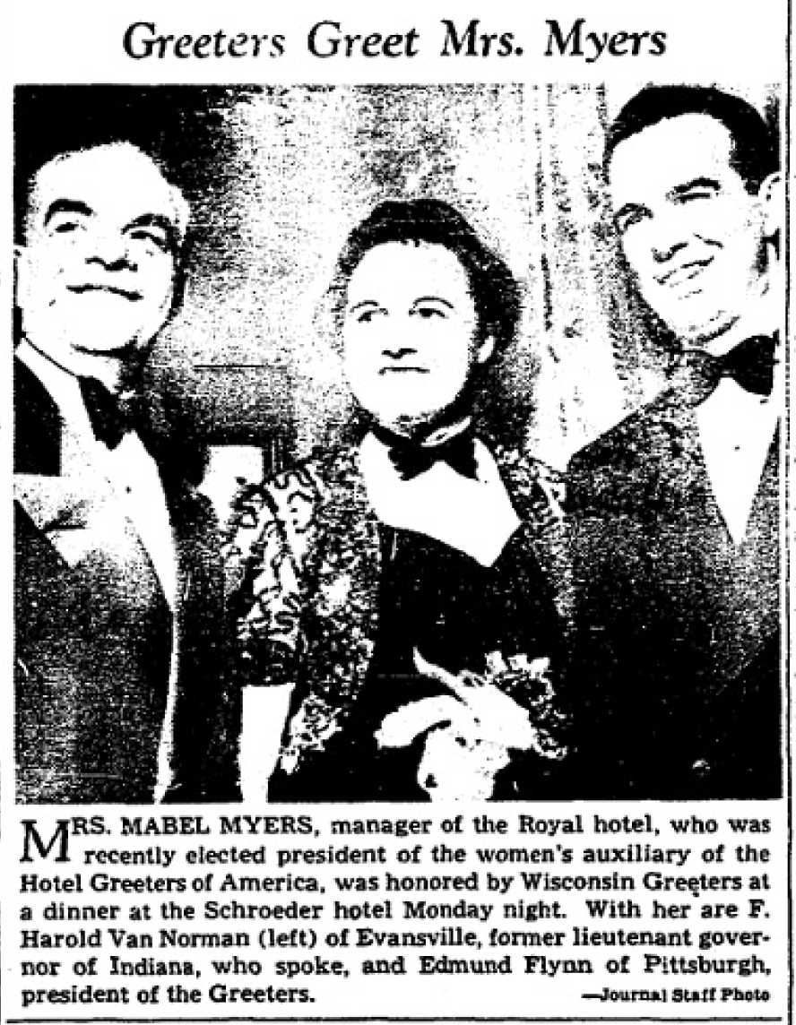 While maintaining a pristine public reputation as the international president of hotel greeters, and chair of local hotel workers' unions, women's auxiliaries, and other charitable groups, Meyers privately fostered one of the first-known gay and lesbian gathering places in Wisconsin. Throughout the 1930s and 1940s, the Royal Hotel Bar was a hotspot of queer culture, known only through carefully-guarded word of mouth marketing. When the hotel was razed in 1973, elders recalled this being the first and only place in Milwaukee where gay people could gather in public. They also remembered Meyers renting rooms to same-sex couples-- at a time when this wasn't allowed anywhere.
