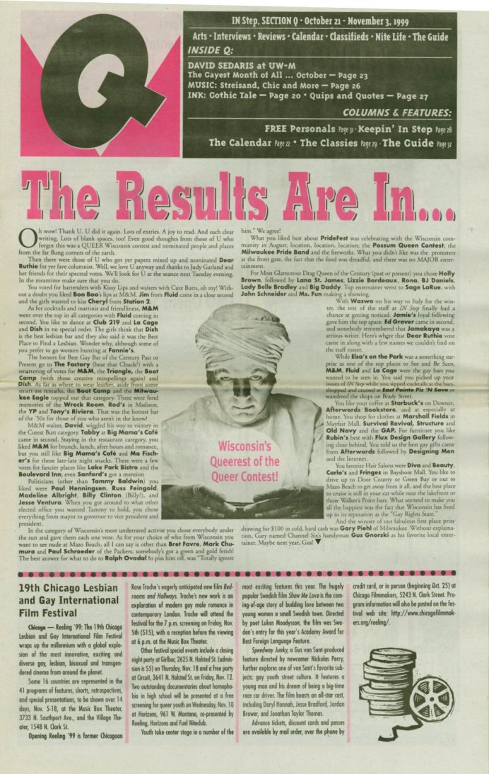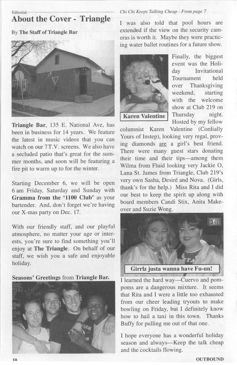 James was born in Massachusetts in 1967. When James was 5, he and his mother moved to Albuquerque NM. There he met Damien Rose who became his life long friend. They both moved to Milwaukee in 1991. James became a bar tender at C'est La Vie. He then worked at and lived behind Walker's Point Cafe. I remember that apartment as we had been there several times, one, so James could make me up in drag for Halloween. He had one entire room he converted into a huge closet. Yes, James was a very popular drag queen. "Lana St. James" performed at shows all over the state, most of which were for charity. He also became the unofficial "mother" to the up & coming drag queens. He often referred to them as his "bitches". He also worked at Partners and then In Between just prior to him purchasing Triangle Bar in 2000 from Rob Bruckner. Bruckner had run the business into the ground so James had his work cut out for him. He slowly grew the business back to the days of Al Thomas owning it. His favorite time of year were the holidays. He loved decorating and every year, there had to be a new theme for each holiday. James was proud of the fact that every year, OutBound magazine put Triangle on the cover of the Christmas Issue. I had stopped in Thursday March 31st, 2011 to discuss the "Remember When" party as we had planned. He wasn't there, which was extremely unusual. He was out the night before, but no matter how much he partied, he always showed up for deliveries. I placed a call to Damien and left a message to check on him when he got home. Later that day, Damien found James had passed away in his sleep. He had died from a torn aorta. James' passing came as a shock to the entire community. Triangle's facebook page exploded with comments of support, love, condolences and memories, many of them funny. The memorial service was held April 3rd at Triangle. People came from all over to celebrate James' life. I'm not even going to try to guess how many showed up but it was alot. There was so much food that much of it was donated to Hope House, a transitional living and emergency housing program. James is survived by his mother Linda and his two younger brothers, Michael and Cole. Linda said she will keep Triangle open. (The preceeding biography was written by Jamie Taylor.) Following is a tribute written by James' long time friend Damien Rose. I had no idea how short forever was. My longtime friend Harry “James” Marr died suddenly on March 31. We met many years ago in New Mexico and have lived in Milwaukee for the last 20 years. James had such a wide-ranging influence on so many people, but on a personal level he changed my life profoundly without even knowing it. I was lucky enough to be able to tell him how he changed mine before he died. There are so many wonderful stories about James – I have a million, just ask. I hope people tell those stories over and over as the years go on, but I want to share how I met James and how it changed everything about my life. Many people who know both of us wonder why we were so close, since we seemed so different. We chose different careers, different lovers, different hobbies and different daily lives. What people didn’t see is that at our core, we were the same. That is the tie that binds. The night I met James, I was barely 17. He was much older and wiser at 22. We were both at the same party. He was tall, loud and having a good time. I was drawn to him and moved closer. He was making fun of the right side of his chest, which was a little sunken from a birth defect. He was walking around covering his chest with a flyer showing a shirtless man with a perfect chest and asking people to feel his perfect chest. This was the ’80s, and my friends and I had hair dyed all the colors of the rainbow and, of course, teased out as much as possible. He was yelling, “Somebody get me a comb! I need to fix these kids’ hair!” I was instantly intrigued with him. We talked all night until the sun came up. I had been raised by a conservative family and had learned what appropriate behavior was and what should be said out loud. I also knew what was expected of me and how my life was supposed to go. I had never met someone like James who spoke out loud what I was thinking in my head. I believed the way I thought was inappropriate and should be kept inside, and here was someone who let what was in his head come out of his mouth. It was funny and usually correct and it didn’t spawn the negative reactions from others I had been told it would. Quite the opposite, it brought people together socially in a way I hadn’t seen before. It brought everyone to the same level. By highlighting his differences, he made people realize that their differences made them interesting and that nobody is better than anybody else. From that day on, I learned that the thoughts in my head could come out. I could say how I felt. This extended to being who I was with no apologies. It was a freedom I had never known. I am so grateful to James for leading by example and helping me discover this early in my life. That lesson has profoundly affected the person I am today. Because of James Marr, I have led a life of freedom! Thank you, James and I’ll see you on the other side." Your BFF, Damien Rose Recollections: The following are recollections of others who have been kind enough to submit their personal memories to the webmaster. You are welcome to do the same! "When someone was homeless, he gave them a place to stay. When someone was unemployed, he would pay them to do odd jobs even if those jobs did not really need to be done. When PrideFest was in financial trouble, he joined in with other venues and held fund raisers to help out. Those are some things I remember about him. He also had a great sense of humor. A lesbian walks into Triangle, James says, "Finally! A person with real facial hair!" "Thanks, James for all you did for Ric Fest! You are going to be greatly missed! Lana St. James was one of th