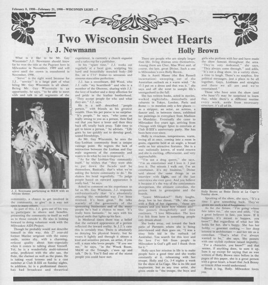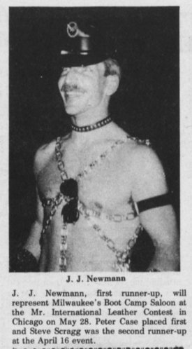 J.J. Newman was elected Mr. Gay WIsconsin at the Pageant in Milwaukee in November, 1989, serving until the crown was transferred in November, 1990.