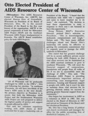 Sharon Otto was elected as President of the ARCW (AIDS Resource Center of Wisconsin) in 1990, the 2nd person to hold that position in the organization's 5 years history (succeeding Marc Haupert). Sharon, of Greenfield, began volunteering for ARCW in 1985, and joined the Board of Directors in 1987.