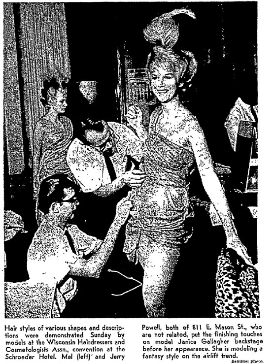 It's also unknown when Jerry took the name "Powell," but this symbolic gesture definitely raised some eyebrows in pre-marriage Milwaukee. In 1961, the Milwaukee Journal pictured the couple dressing an exotic dancer at the Wisconsin Hairdressers Conference, noting "Mel and Jerry Powell, both of 811 E. Mason, are not related."