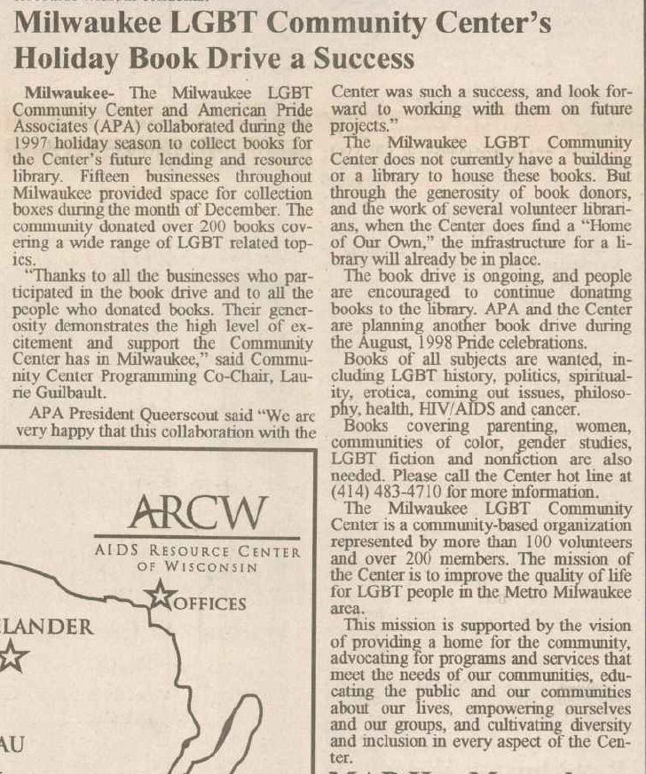 Queerscout appears as 'APA President' (American Pride Associates) in a Wisconsin Light article in January 1998 as leading an effort to assemble a library for the planned Milwaukee LGBT Community Center.