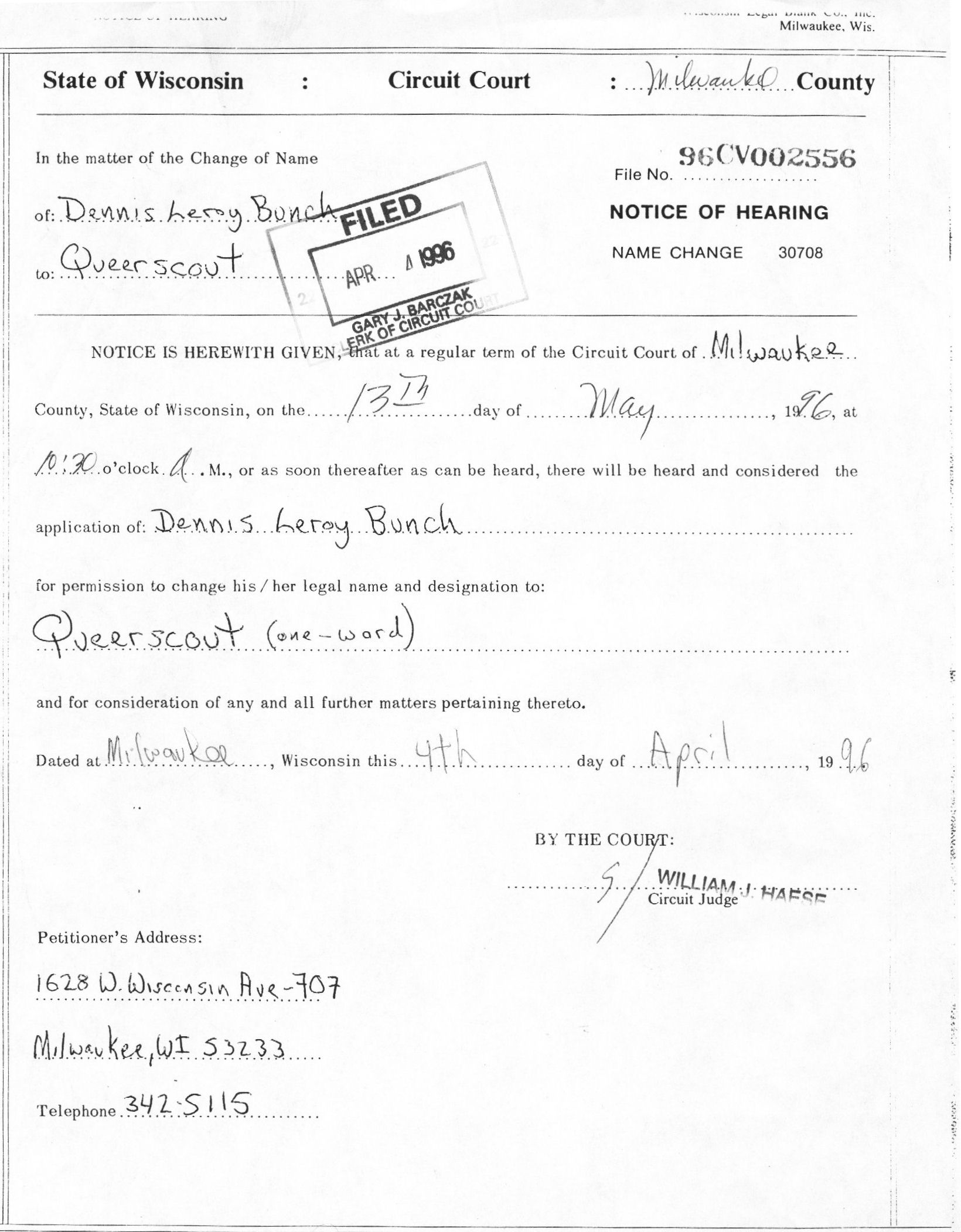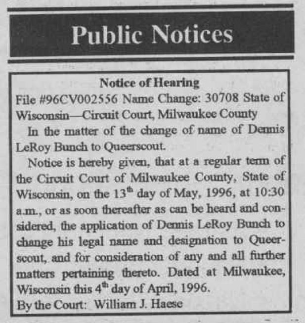 Dennis began using the name 'Queerscout' sometime prior to 1991, but appears to have initially used that name only occasionally and informally. In April 1996 he filed papers in Milwaukee County Circuit Court to have his name legally changed to simply "Queerscout".