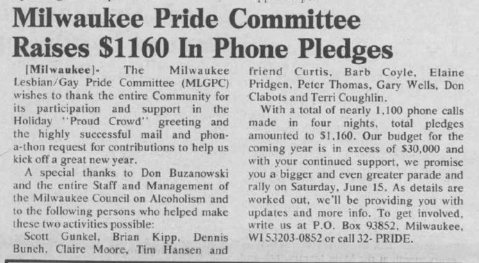 Pride Committee phone fundraising Dennis Bunch mentioned (Wis Light vol 4-04, February 1991)