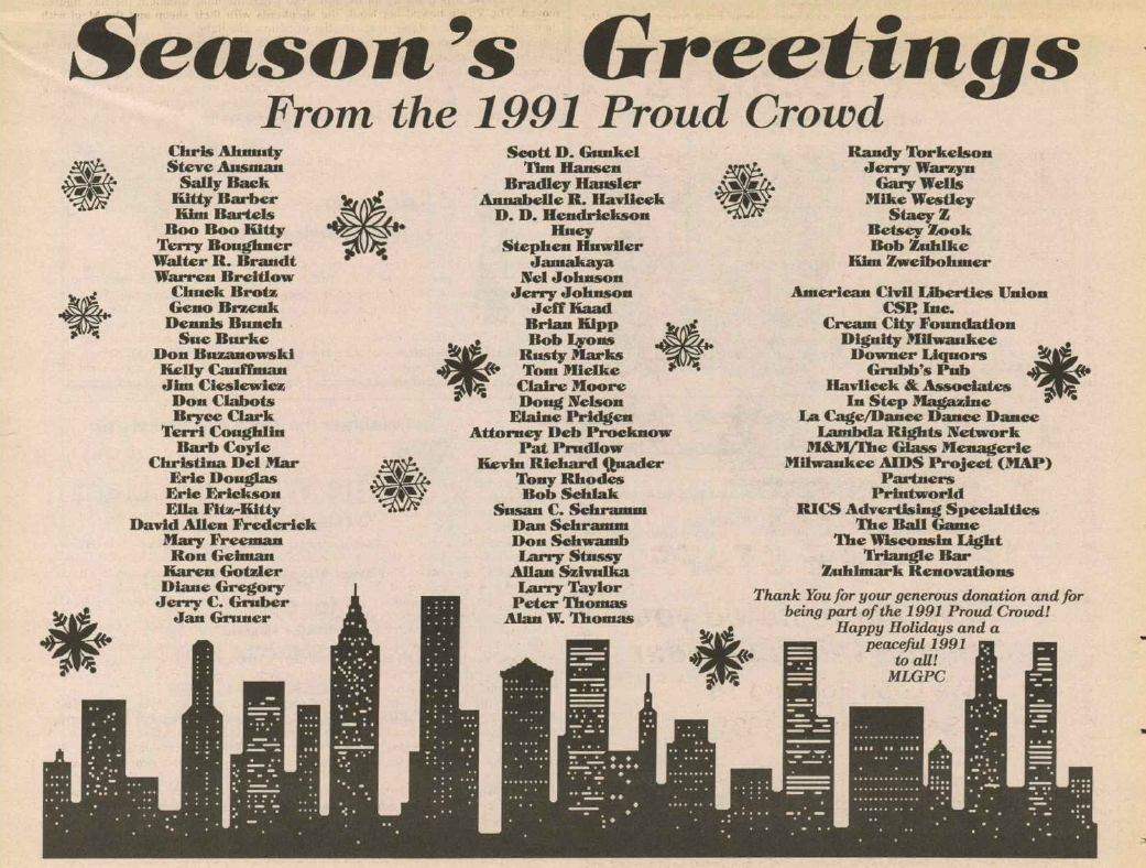 1991 Prowd Crowd Seassons Greetings ad Dennis Bunch included (Wis Light vol 3-25, December 1990)