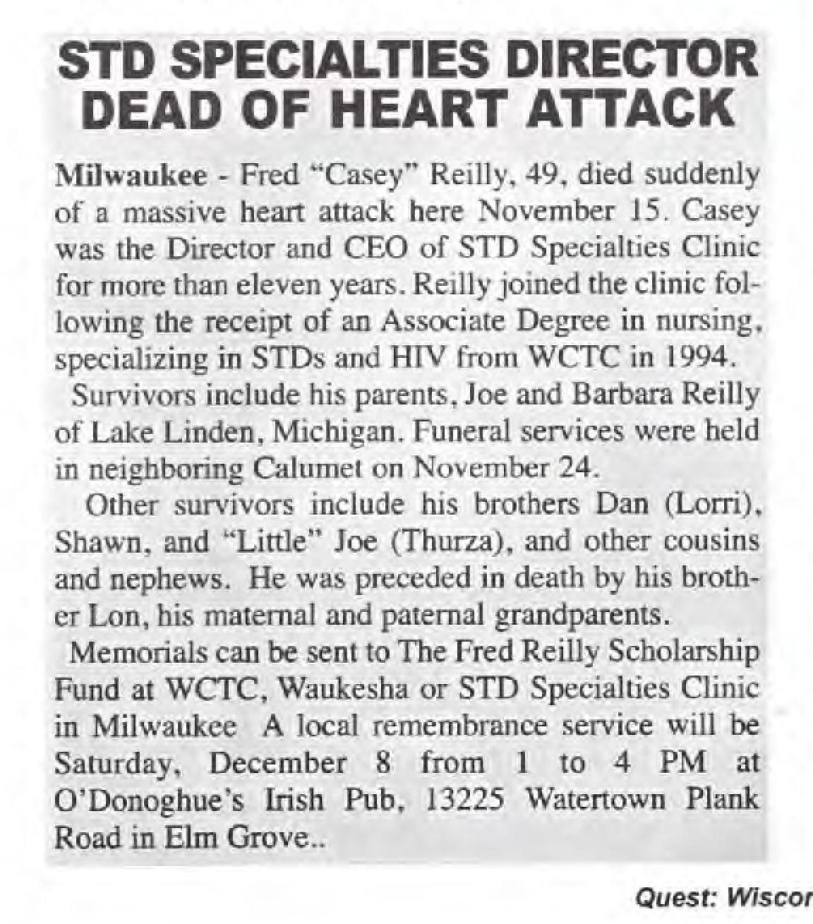 Fred Reilly, better known as "Casey", passed away following a heart attack on November 15 of 2007. Casey was known in the LGBTQ community as Director and CEO of STD Specialties Clinic, which offered free healthcare such as HIV and other STD screening and treatment. Casey's death was reported in an article in Quest magazine vol. 14-19 in November 2007: STD SPECIALTIES DIRECTOR DEAD OF HEART ATTACK Milwaukee- Fred "Casey" Reilly, 49, died suddenly of a massive heart attack here November l5. Casey was the Director and CEO of STD Specialties Clinic for more than eleven years. Reilly joined the clinic following the receipt of an Associate Degree in nursing, specializing in STDs and HIV from WCTC in 1994. Survivors included his parents of Lake Linden, Michigan. Funeral services were held in neighboring Calumet on November 24. Other survivors include three brothers and other cousins and nephews. He was preceded in death by his brother Lon, his maternal and paternal grandparents. Memorials can be sent to The Fred Reilly Scholarship Fund at WCTC, Waukesha or STD Specialties Clinic in Milwaukee. A local remembrance service was held Saturday, December 8 at O'Donoghue's Irish Pub in Elm Grove. |