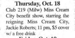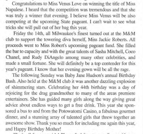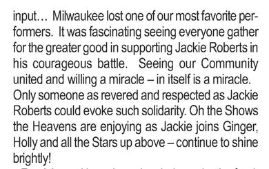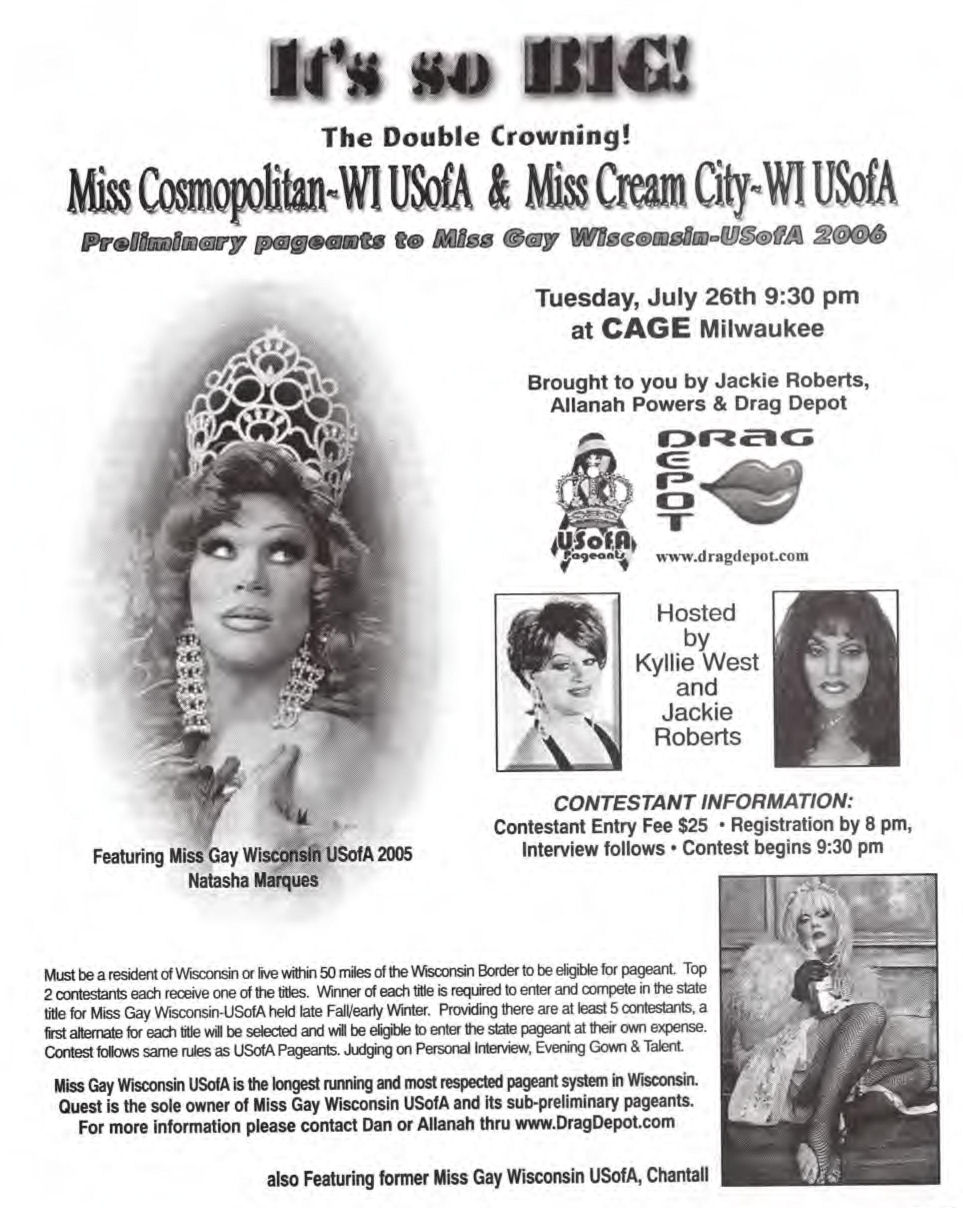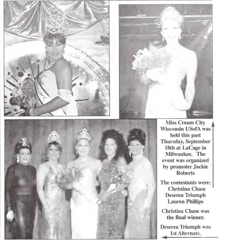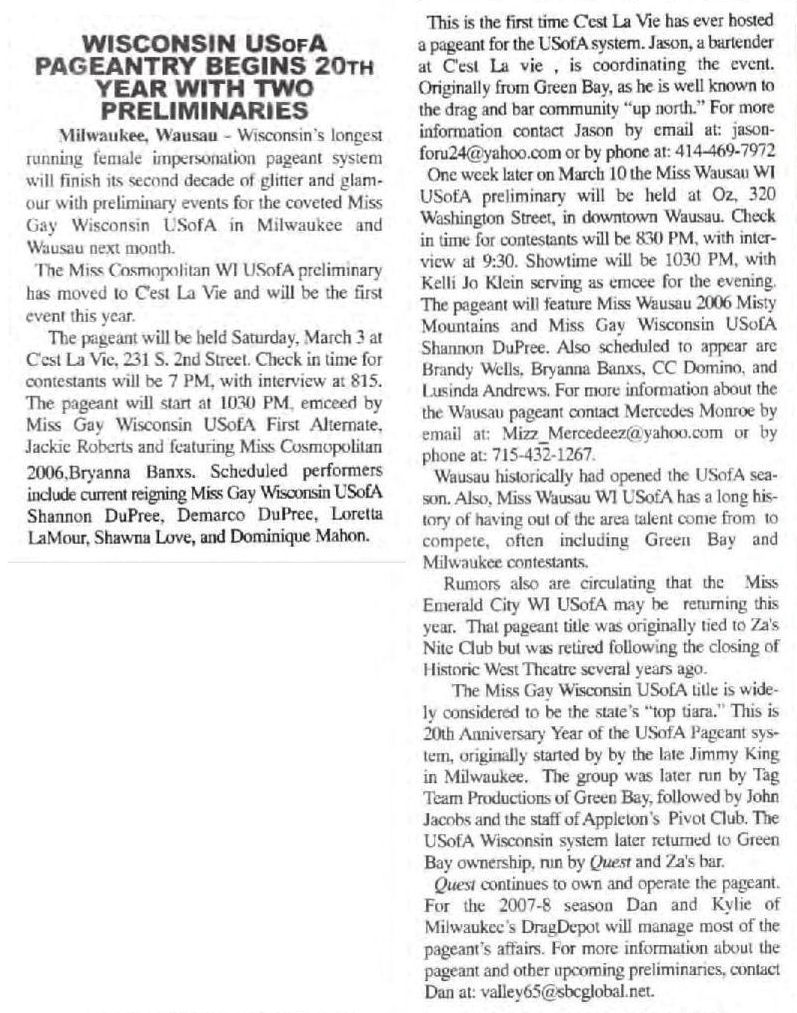 Mention of upcoming Miss Cream City USofA pageant in "Drag It Out Of Me"column by Miss Lilly White, mentioning that Jackie "hasn't entered anything in 12 years"; (Jackie subsequently won that contest) Quest magazine v8-09