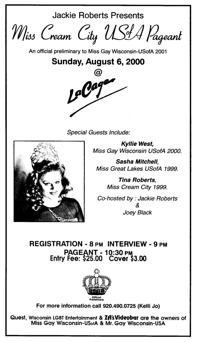 Advertisement, Miss Cream City USofA Pageant, Jackie as co-host Quest magazine v7-13, August 2000