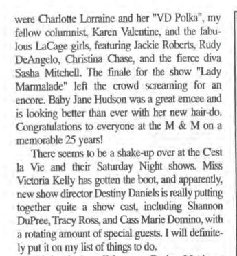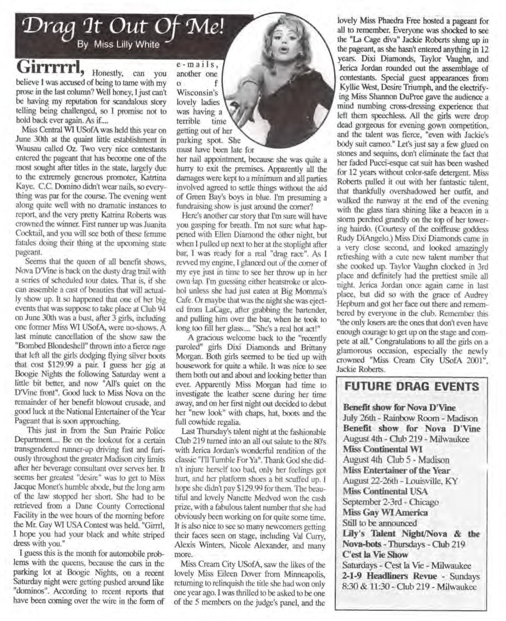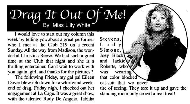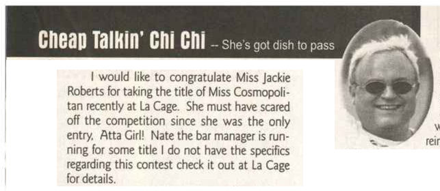 Jackie featured in "Drag It Out Of Me" column by Miss Lilly White Quest magazine v7-16, Sept. 2000