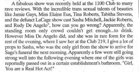 Article, show at 1100 Club featuring "defunct LaCage show cast" including Jackie Quest magazine v8-05, May 2001