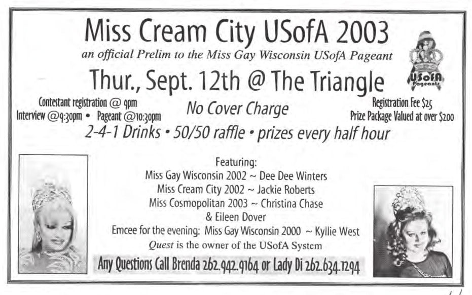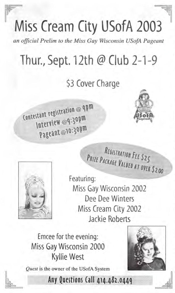 Advertisement, Miss Cream City USofA pageant at La Cage: current crown holder Jackie Roberts to pass on her 2002 crown Quest magazine v10-11, Sept. 2003