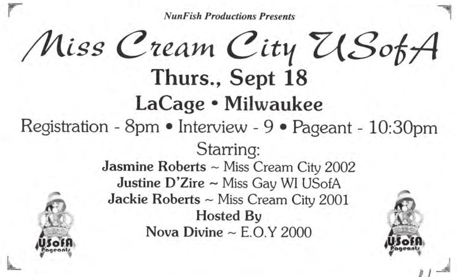Advertisement, Miss Cream City USofA lists Jackie as holding current crown as Miss Cream City 2002 Quest magazine v9-09, August 2002