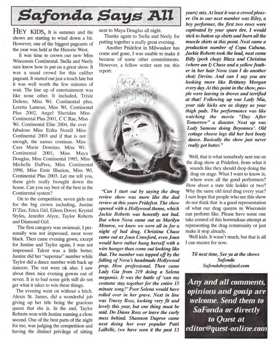 Critcism of PrideFest Drag Review show in column "Sofonda Says All" Quest magazine 11-12, June 2004