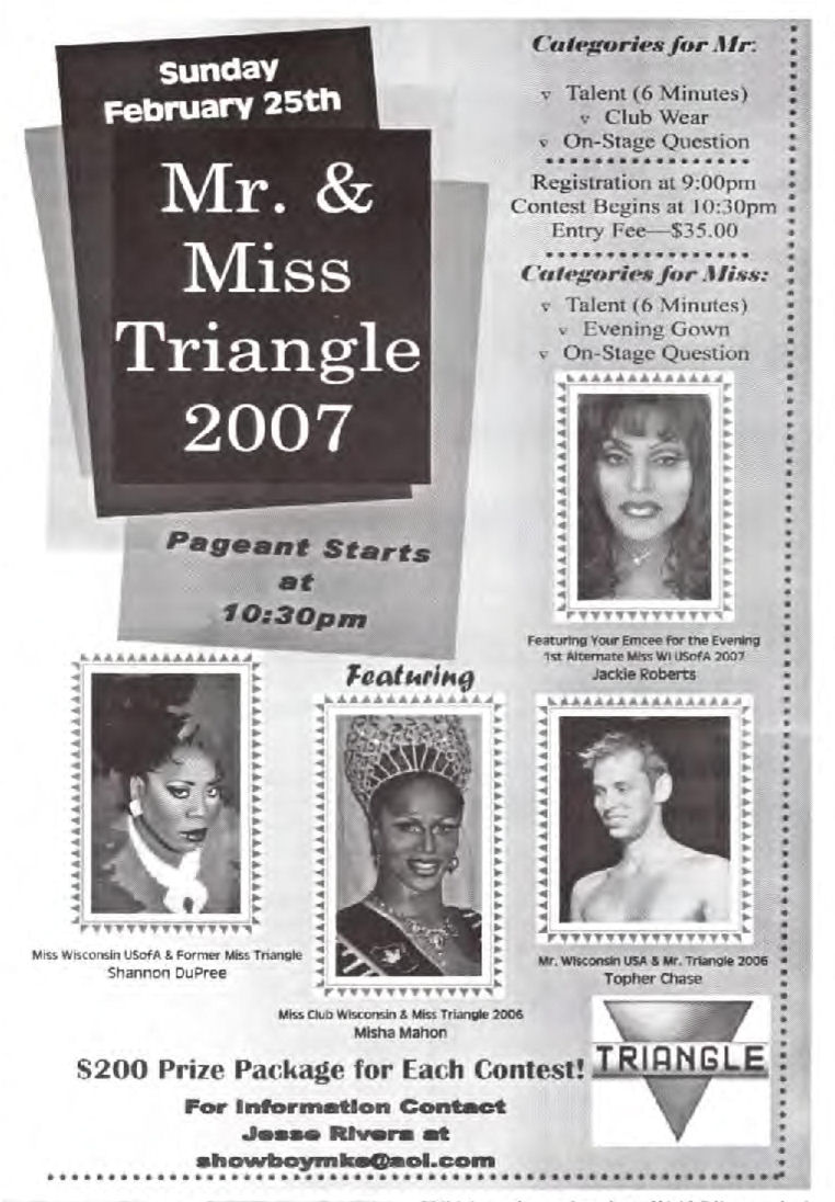 Advertisement, Mr. & Miss Triangle contest, emcee: 1st Alternate Miss WI USofA 2007, Jackie Roberts Quest magazine v14-01, Feb. 2007