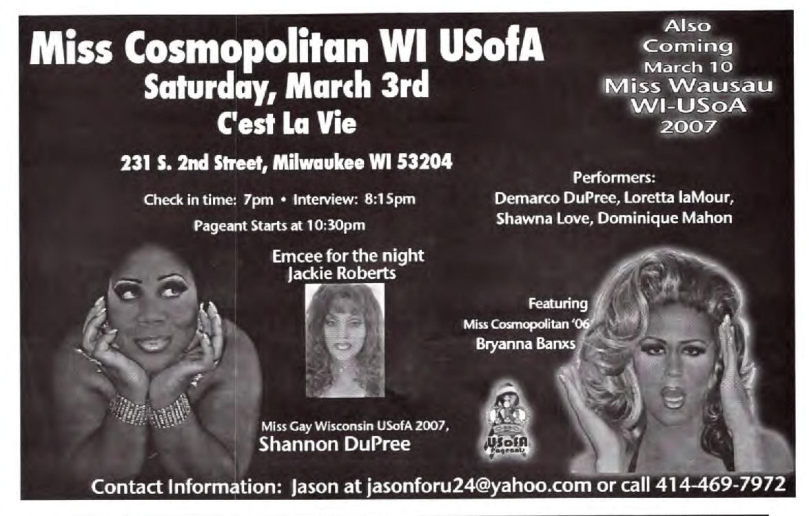 Advertisement, Miss Cosmopolitan WI USofA contest, emcee: Jackie Roberts Quest magazine v14-01, Feb. 2007