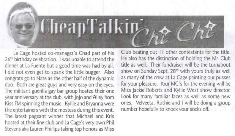 Article, show including "fabulous LaCage girls" Quest magazine v8-08, July 2001