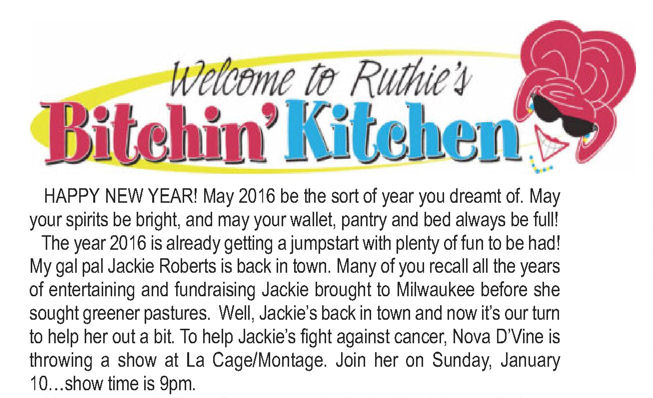 Mention in Ruthie's "Bitchin' Kitchen" column (Quest vol 23-01, January 2016)