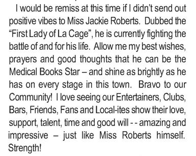 Article, show at M&M Club "to support the towering diva herself, Miss Jackie Roberts" and upcoming pageant fund Quest magazine v8-12