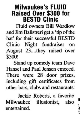 Article, Fluid bar fundraiser for BESTD Clinic Quest magazine v7-15, August 2000