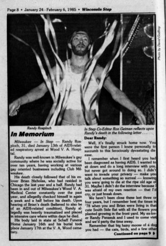 Randy Rosploch was well known in Milwaukee's gay community, where he was socially active for over 10 years, having worked at various gay oriented business including Club Baths Milwaukee.