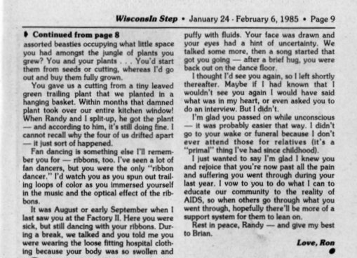 Randy's death, of AIDS-related respiratory arrest at Wood V.A. Hospital, closely followed that of his ex-lover Brian Nicholas, of Chicago. Ron Geiman, editor and publisher of In Step magazine, wrote in his obituary in that magazine that Randy's death caused AIDS to finally strike home with him (Ron), with Randy being the first person he knew closely to succumb to the disease. (Ron was later to die of AIDS himself.)