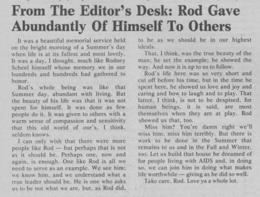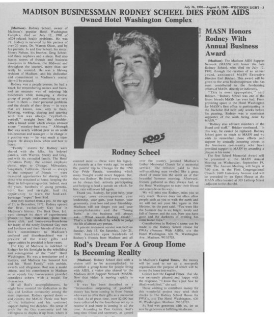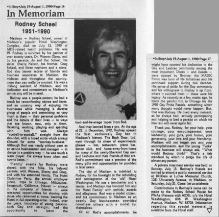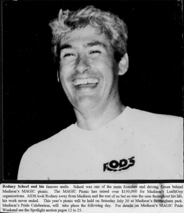 Rodney Scheel was the founder and owner of the bar "Rod's", in Madison, which was to become a gay icon and legend among gay men. Located in the lower level (basement) of the Hotel Washington just west of downtown Madison (which Rodney owned with his brother Greg), and with a decidely leather/levi ambiance, the bar became an extremely popular destination for men throughtout Wisconsin and even from northern Illinois. At the age of 21, in December, 1972, Rodney opened the first exclusively Gay bar in Madison's history. This bar, The Back Door, Ltd. went through its share of experimental phases- bar, restaurant, piano bar, dance club, and home-away-from-home for many of the newly-liberated Gay men and Lesbians and their friends of that era. But already at this young age, Rod's commitment to Madison to make that bar a success was a preview of the many gifts and opportunites he provided in later years. Rodney was a people person; he had a knack for remembering names and faces, and an uncanny way of enjoying his businesses while managing a diverse group of people and committing so very much to them. After opening Rod's bar, and with its success, the Hotel Washington gradually became a complex of activity. Upstairs in front, a cafe/restaurant, the Cafe Palms, was opened, and was often busy, especially popular for Saturday and Sunday brunch. On the same level, "Club de Wash" was popular with the straight community, and frequently had live bands performing. Then, the upstairs of the hotel building became the setting for The New Bar, which quickly took its place as "the" dance bar in Madison. Several rooms in the upper level of the hotel were also available for renting by out-of-towners during special events and weekends (such as the annual pride weekend). But in the 1980's, the AIDS epidemic took hold, and Rodney was an early victim. Rodney died after a long and drawn out battle, having not set foot in his bar or succcessful hotel complex for almost a year.He was survived by his partner of over 20 years, Dr. Warren Olson, by his parents Jo and Doc Scheel, his sister Sherry Nelson, his brother Greg Scheel, and three nephews and a niece. A private internment service for Rodney was held on Sunday, July 15, 1990. On Saturday, July 21, hundreds of Rodney's friends from Madison and all over the country jammed Madison's Luther Memorial Church for a memorial service. Afterward, friends gathered as they always had, at the Hotel Washington to toast their friend and comrade on his way. Contributions in Rodney's name were encouraged to be made to the Rodney Scheel House for PWAs (Persons with AIDS). When Rodney became very sick, his brother Greg took over and carried on management of the businesses in the Hotel complex very ably. The final chapter was to take place a few years later. On the cold morning of Sunday, February 18, 1996, a fire was somehow sparked in the Hotel Washington, which still housed the wildly popular Rod's, New Bar, Club de Wash, and Cafe Palms. In the bitter cold, the fire department called several alarms, but to no avail- by morning the remains of the complex were a few badly charred and leaning walls, somehow with a pride flag still flying. Although there was talk of rebuilding, that was not to be, and Rodney's named legacy came to an end. But Rodney lives on 15 years later in memories, in the continued success of the annual MAGIC picnic, and the freedom that Madison and Wisconsin citizens still enjoy in openly celebrating their lives as gay and lesbian people. |