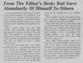 ![]() An early photo of Rodney ![]() Last letter from Rod to customers ![]() Obituary In Step - vol 7 issue 14 ![]() Photo of Rod from In Step Obituary ![]() Obituary Wisconsin Light - vol 3 issue 15 Read text of Obit/biography. ![]() Editorial at Rod's death Wisconsin Light - vol 3 issue 15 |