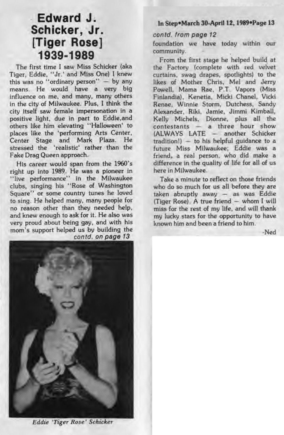 Edward Joseph Schicker, Jr. was best known as drag performer "Tiger Rose". His life is described in the In Memoriam column of In Step magazine by his friend 'Ned': The first time I saw Miss Schicker (aka Tiger, Eddie, "Jr.' and Miss One) I knew this was no "ordinary person"- by any means. He would have a very big influence on me, and many, many others in the city of Milwaukee. Plus, I think the city itself saw female impersonation in a positive light, due in part to Eddie and others like him elevating "Halloween' to places like the 'performing Arts Center, Center Stage and Mark Plaza. He stressed the 'realistic' rather than the Fake Drag Queen approach. His career would span from the 1960's right up into 1989. He was a pioneer in "live performance" in the Milwaukee clubs, singing his "Rose of Washington Square" or some country tunes he loved to sing. He helped many, many people for no reason other than they needed help, and knew enough to ask for it. He also was very proud about being gay, and with his mom's support helped us by building the foundation we have today within our community. From the first stage he helped build at the Factory (complete with red velvet curtains, swag drapes, spotlights) to the likes of Mother Chris, Mel and Jerry Powell. Mama Rae, P T. Vapors (Miss Finlandia), Kenetia. Micki Chanel, Vicki Renae, Winnie Storm, Dutchess. Sandy Alexander. Riki, Jamie, Jimmi Kimball, Kelly Michels, Dionne, plus all the contestants-- a three hour show (ALWAYS LATE-- another Schicker tradition!)-- to his helpful guidance to a future Miss Milwaukee; Eddie was a friend, a real person, who did make a difference in the quality of life for all of us here in Milwaukee. Take a minute to reflect on those friends who do so much for us all before they are taken abruptly away-- as was Eddie (Tiger Rose). A true friend-- whom I will miss for the rest of my life, and will thank my lucky stars for the opportunity to have known him and been a friend to him. --Ned |