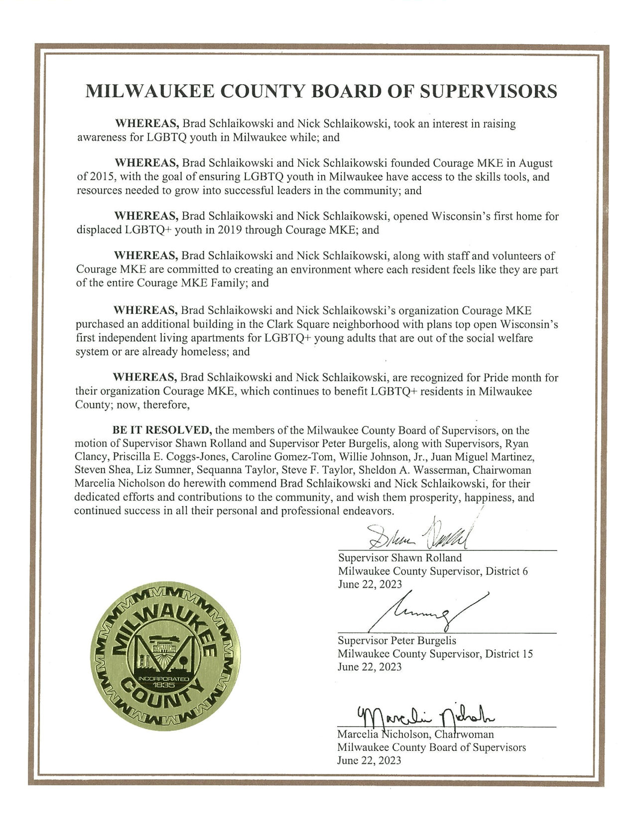- WHEREAS, Brad Schlaikowski and Nick Schlaikowski, are recognized for Pride month for their organization Courage MKE, which continues to benefit LGBTQ+ residents in Milwaukee County; now, therefore,