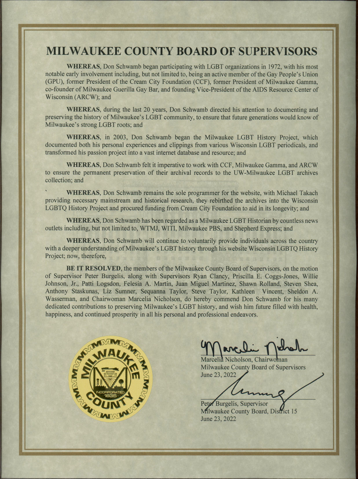 WHEREAS, Don Schwamb remains the sole programmer for the website, with Michael Takach providing necessary mainstream and historical research, they rebirthed the archives into the Wisconsin LGBTQ History Project and procured funding from Cream City Foundation to aid in its longevity; and