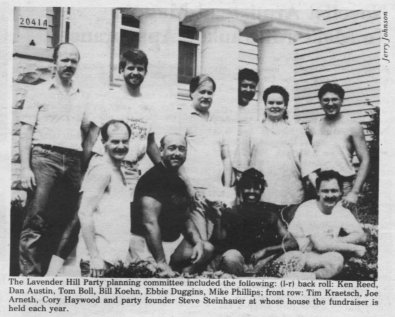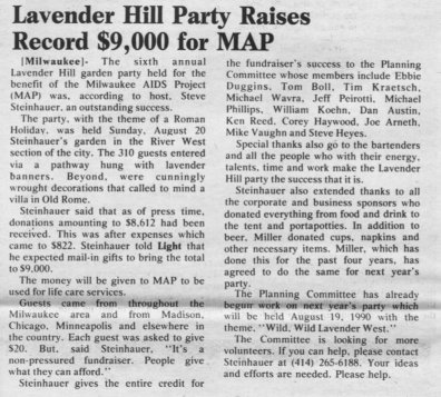 Steve Steinhauer was the founder of an annual garden party to benefit AIDS causes, called the Lavender Hill garden party. The first such party was held in 1984, and the last party was held in the early 1990's when Steve moved out of Milwaukee. |