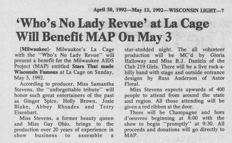 Born 'Sam Saglin' in 1950, he became widely known as 'Samantha Stevens', entering drag queen pageants in Milwaukee, Ohio and San Francisco, and eventually becoming a drag show producer in Milwaukee. In 2021, Samantha was interviewed by LGBT historian and Curator of the Wis LGBTQ History Project, Michail Takach. He wrote the following biography as a result of that interview: From second place showgirl to stunning swan song Meet Samantha Stevens, the mother of the Golden Age of Milwaukee Drag Sam was born in Milwaukee in 1950. He grew up in the Mid-City neighborhood around 37th and Kilbourn. One of his favorite childhood memories is watching the Miss America pageant every year, while the rest of his family wanted to change the channel. He also remembers decorating the house for the holidays with his mother and grandmother, and always trying to create picture perfect experiences. Like many queer youth, he was sometimes teased by neighborhood kids. "Ah, it was alright for me," he said. "I had older brothers who would protect me when people would say things. I just didn't really pay attention to the bullies. I didn't give them the time of day." He remembers his father pointing out the old Mint Bar (422 W. State St.) as they drove past it. He'd also share the story of how he got "manhandled" there by gay men in the 1950s, something that made the emerging Samantha raise an eyebrow or two. As he got older, he began to seek out his people. "When we were underage, we would meet up with the queens at Big Boy on 5th and Wisconsin," said Sam. "I'd heard about the Loop Cafe, but I think it was closed already." "That's how we found out about gay places back then: meeting people and sharing stories. A lot of gay people hung out on Wisconsin Avenue, so we'd walk up and down the street to find them. There are a lot of people still alive who got into the gay community at that Big Boy!" "The first gay bar I ever went was the River Queen," said Sam. "I entered the Miss River Queen contest and got second runner up. It was the grooviest place, and everybody went there. I remember a long, narrow bar, with a short dancefloor, but I can't remember anyone who worked there!" Sam remembers the ruling queens of the era: Tiger Rose, Billie Shephard, Andretta, Duchess, Josie Carter, Jamie Gays, Mama Rae, Brandy Alexander, Ricki Vegas, Vicky Renee, Peaches Toy, the Powell Sisters, Andretta, Stormy Weather, Mother Chris. "There were so many of them – and they would all talk about the pageants with such reverence," said Sam. "I was fascinated by the costumes and performances and so inspired by these stories. So I started doing drag myself." Sam started working at the Ad Lib Nightclub (323 W. Wells St.) as Samantha. The bar was an early and unlikely refuge – and reliable source of good income -- for drag queens and transgender women. Owned by the Balistrieri crime family, the Ad Lib replaced its female strippers with female impersonators in 1969 to circumvent B-girl and obscenity laws. Strange as it was for 1970s Milwaukee, the Ad Lib created opportunities for regional fame and fortune. "Mickey Chanel got me the job," said Sam. "The show was only $2, so the house was always full. There were so many horny sailors! They didn't even know these were female impersonators. They looked THAT good. They had those men in the palm of their hands. And here I was, right in the middle of all that, trying to figure myself out." Sam remembers the opening of The Factory (158 N. Broadway,) one of Milwaukee's first gay dance clubs. "It was the top gay bar in all of Milwaukee. All the queens would come in drag on Friday and Saturday nights, not even to perform, just to see and be seen," said Sam. "They started doing these shows in the backroom – Tiger Rose, Mama Rae, Tina Capri -- but I would just go with Miss Donny for drinks and people-watching." Sam remembers being fascinated with Tiger Rose, a glamour queen who sometimes looked exactly like Kim Novak, and other times like Sheree North. "At that time, drag queens hung out at the Ballgame (196 S. 2nd St.) and the Riviera Show Lounge (183 S. 2nd St.) That was THE drag scene. Ballgame was always a big place for queens, going back to when it was Castaways South and New Jamie's. The Riviera was an interesting one. Tiger Rose worked there too. They were always struggling to find the budget for these gigantic, ambitious shows. They advertised in the paper and tried to bring in a straight audience. That was brave in the early 1970s. Straight people just did not go to gay places!" "Now, these baby queens go anywhere and everywhere, and the gay bars are filled with straight girls." Queen of the pageant scene Sam started dating a boy from Canton, Ohio, and moved there for a while. While there, he entered the first Miss Gay Ohio America pageant in 1973 – and won! Later, he won the Miss Northern Ohio pageant. He spent the next few years going back and forth between Ohio and Wisconsin. "I always loved planning the perfect outfit, you know, evening gowns, shoes, hats, gloves, jewelry, hair. I loved meeting new people. And I probably loved the money!" said Sam. "It felt so natural to become part of this life. Little did I know I would live in drag for the next 40 years." Her next victory was at Michelle's, located in the Royal Hotel at 5th and Michigan, which had been a Milwaukee LGBTQ landmark since the 1930s. In 1972, Michelle, a trans woman from St. Louis, opened a five-day-a-week drag cabaret with reigning hostess Winnie Storm. Michelle's "husband," Sam Mazur, owned the business – at least until September 1973, when it was acquired for redevelopment by Blue Cross Blue Shield, shut down, and demolished. "I really enjoyed the vibe at Michelle's," said Sam. "It was a really nice, up-to-date kind of place, with a restaurant across the lobby. We would all go to that restaurant and drink coffee for hours, gossiping about everything that was going on. I was dating Bill, a bartender who lived in the
