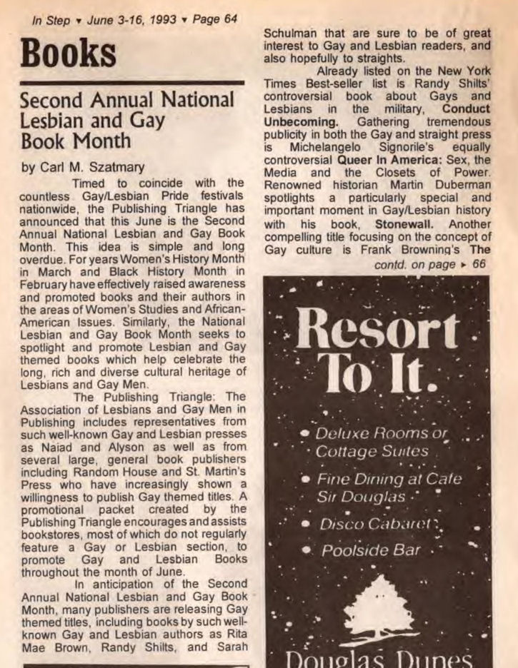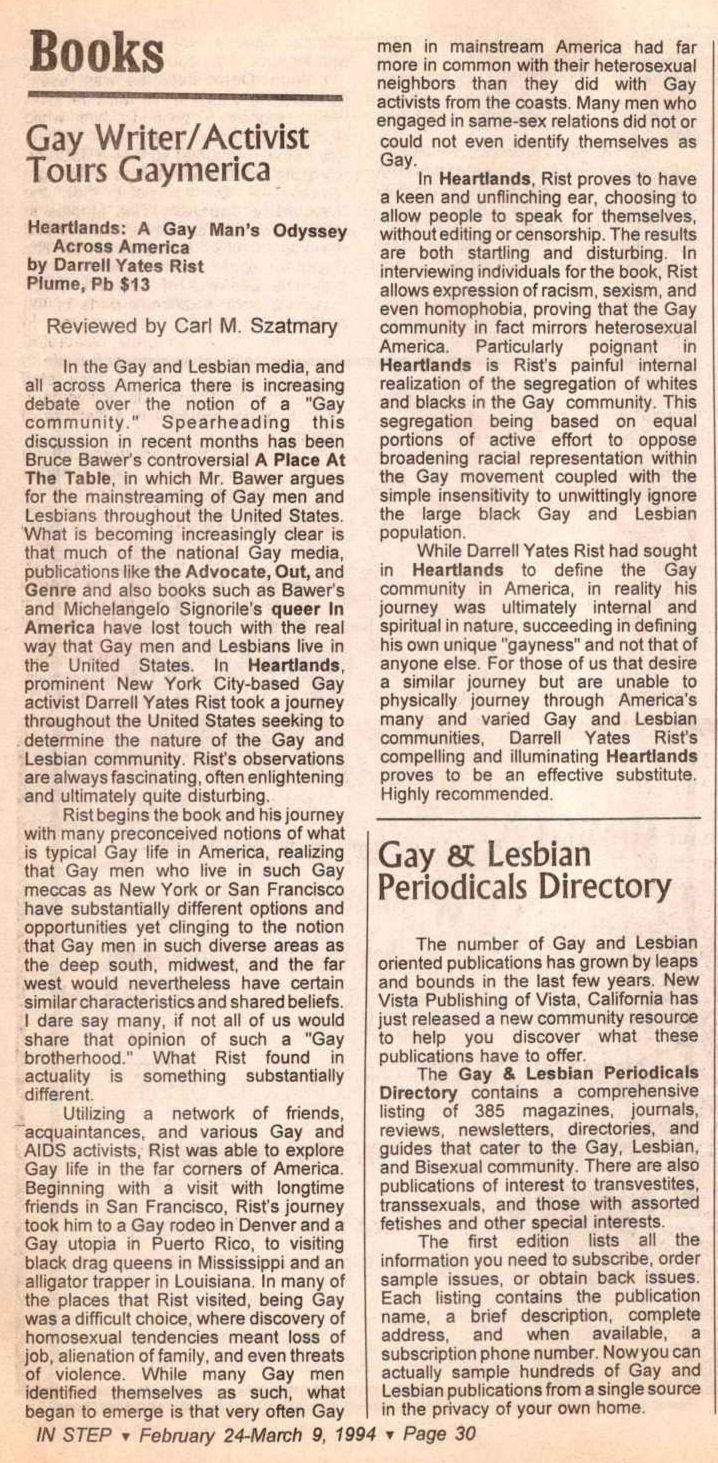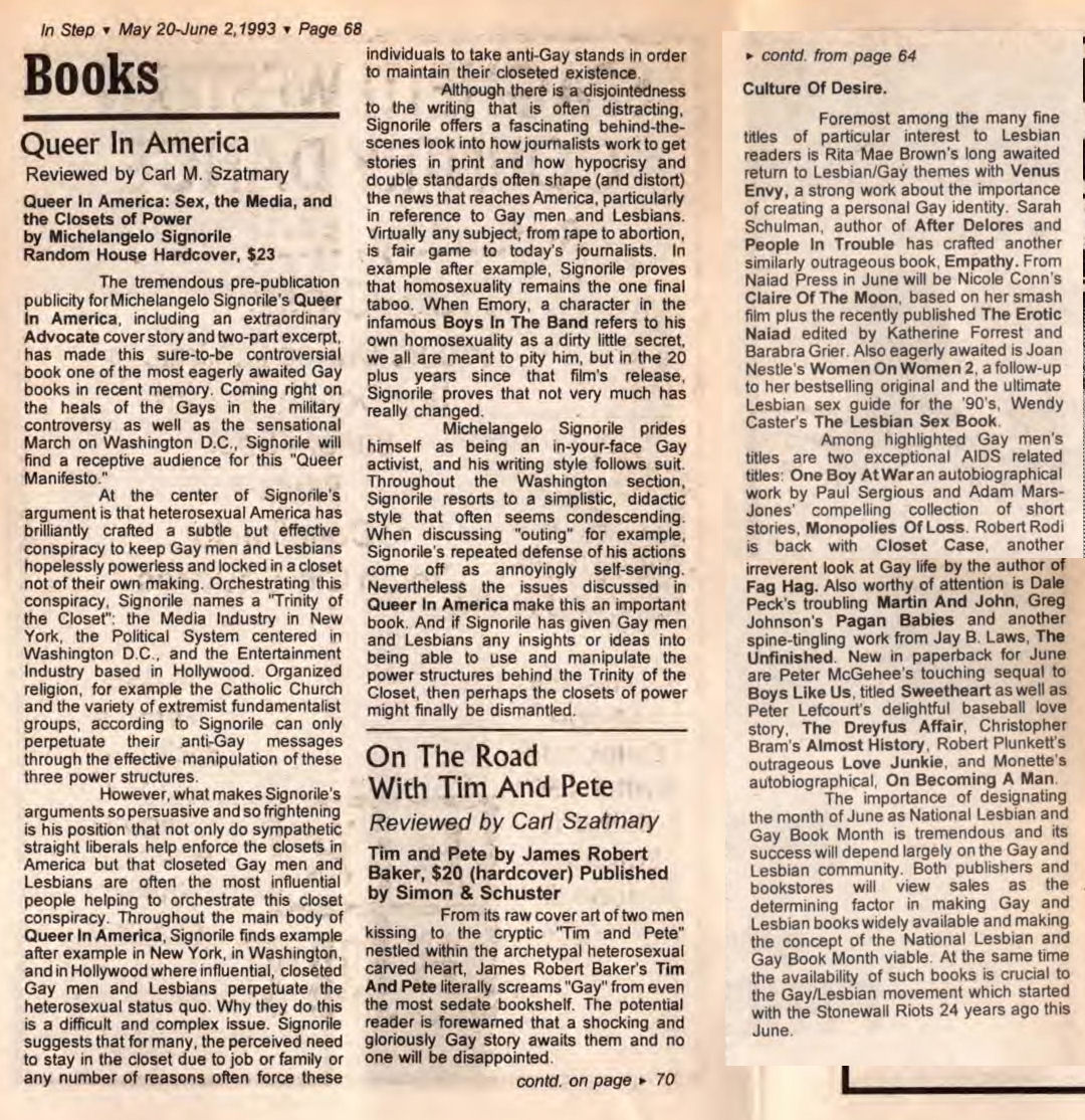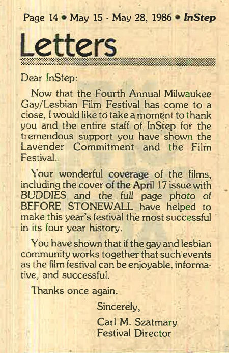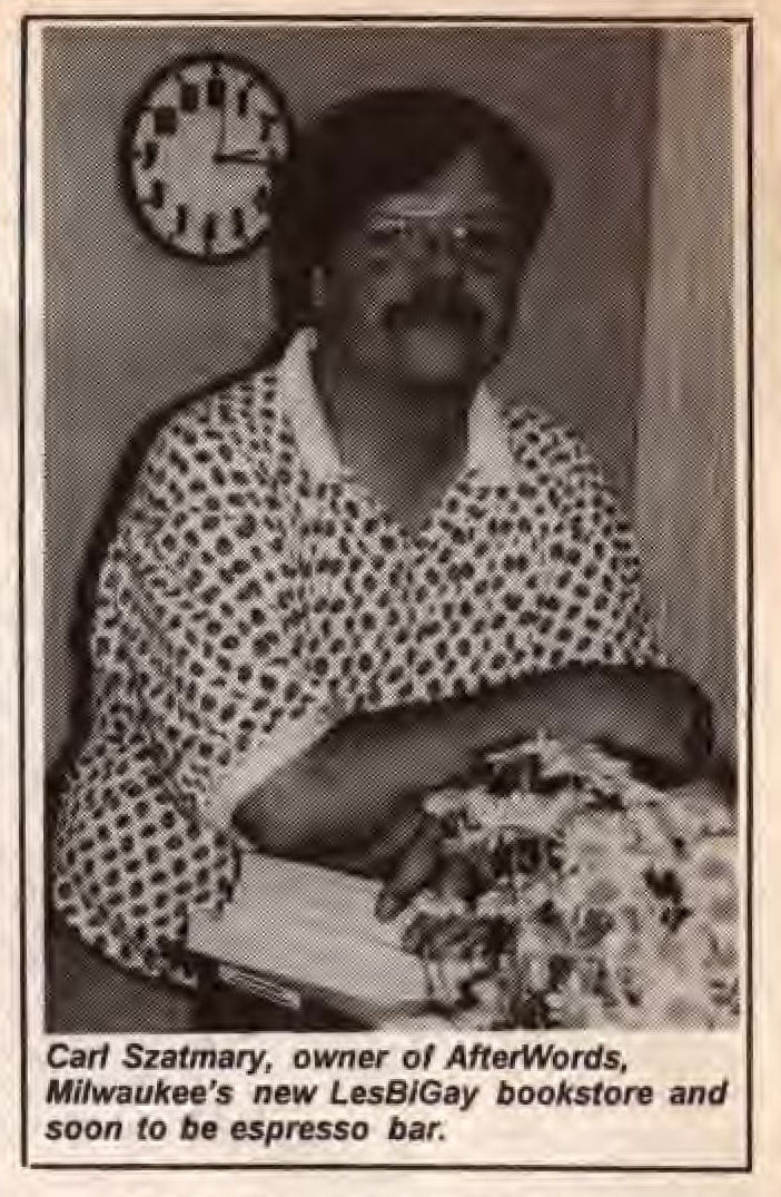 Carl M. Szatmary was involved in many aspects of LGBTQ life in Wisconsin, largely in the Milwaukee area.Szatmary was an early Director of the Milwaukee LGBT Film Festival (at the time called the Milwaukee Gay/Lesbian Film Festival' and sponsored by 'Lavender Commitment' at UWM), until around 1987. In the early 1990's he began writing book reviews for both In Step magazine and Wisconsin Light newspaper. In 1993 Szatmary opened his own bookstore, named Afterwords Bookstore & Espresso Bar. While the store was forced to close briefly in early-mid 2001 due to a trademark issue with another bookstore elsewhere in the country using the same name, he reopened in September 2001 renaming the store Outwords Books, Gifts & Coffee. The store is still operating as of January 2023. Late in 2022, we were informed that Carl Szatmary had been diagnosed with Parkinson's Disease.