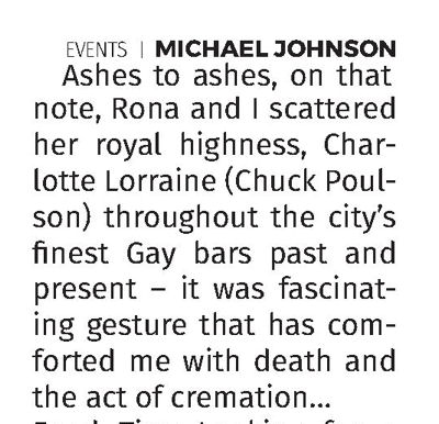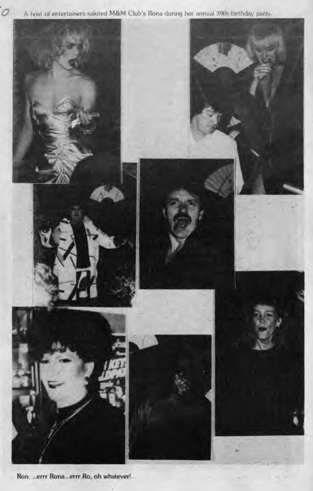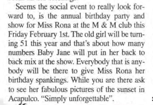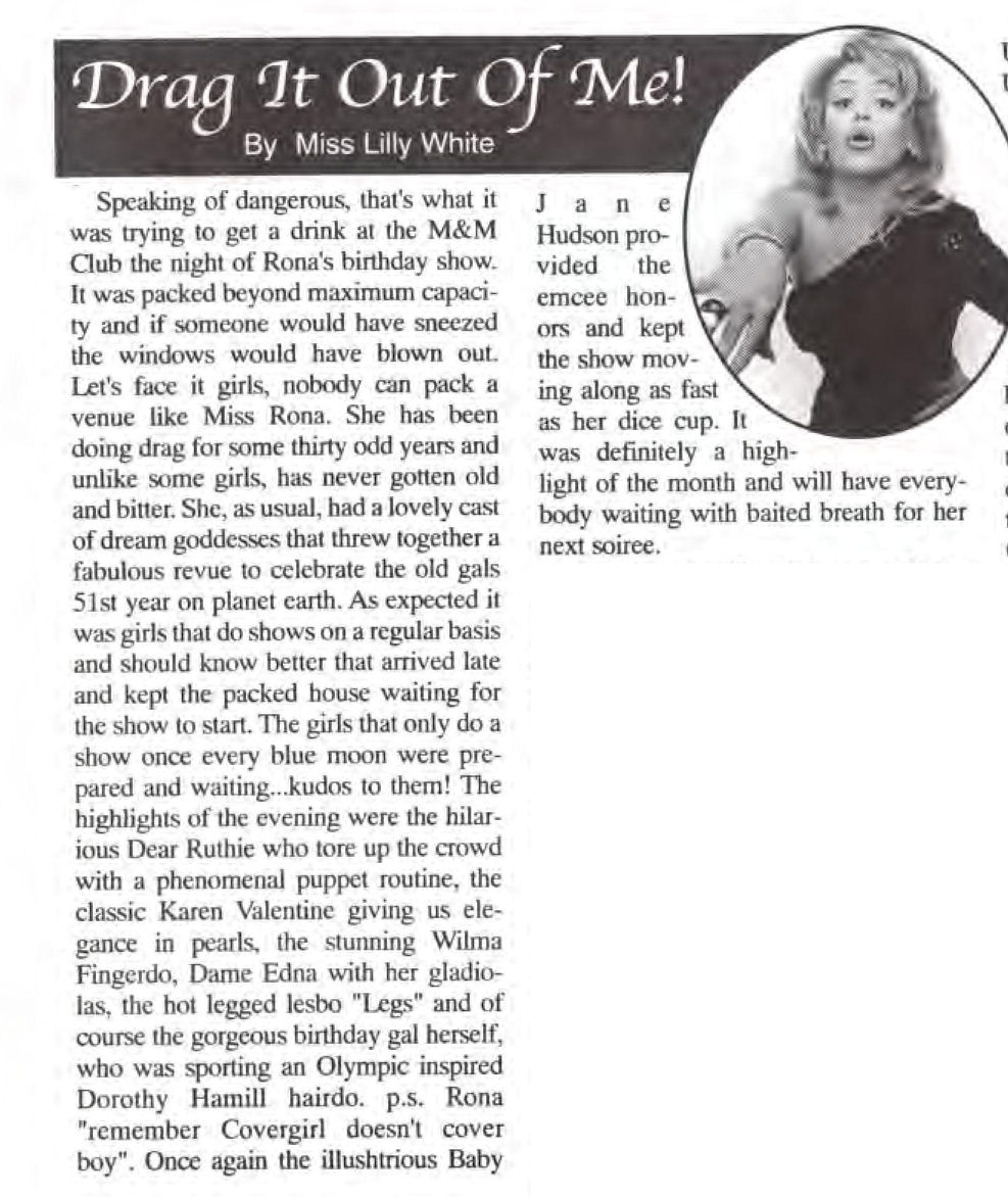 Review of Rona's birthday p[arty and show by Miss Lilly White in her 'Drag It Out of Me' column