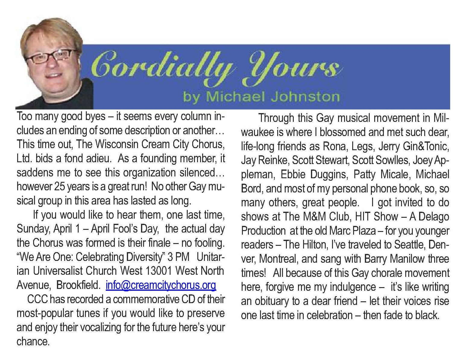 'Cordially Yours' column: Cream City Chorus folding after 25 years
