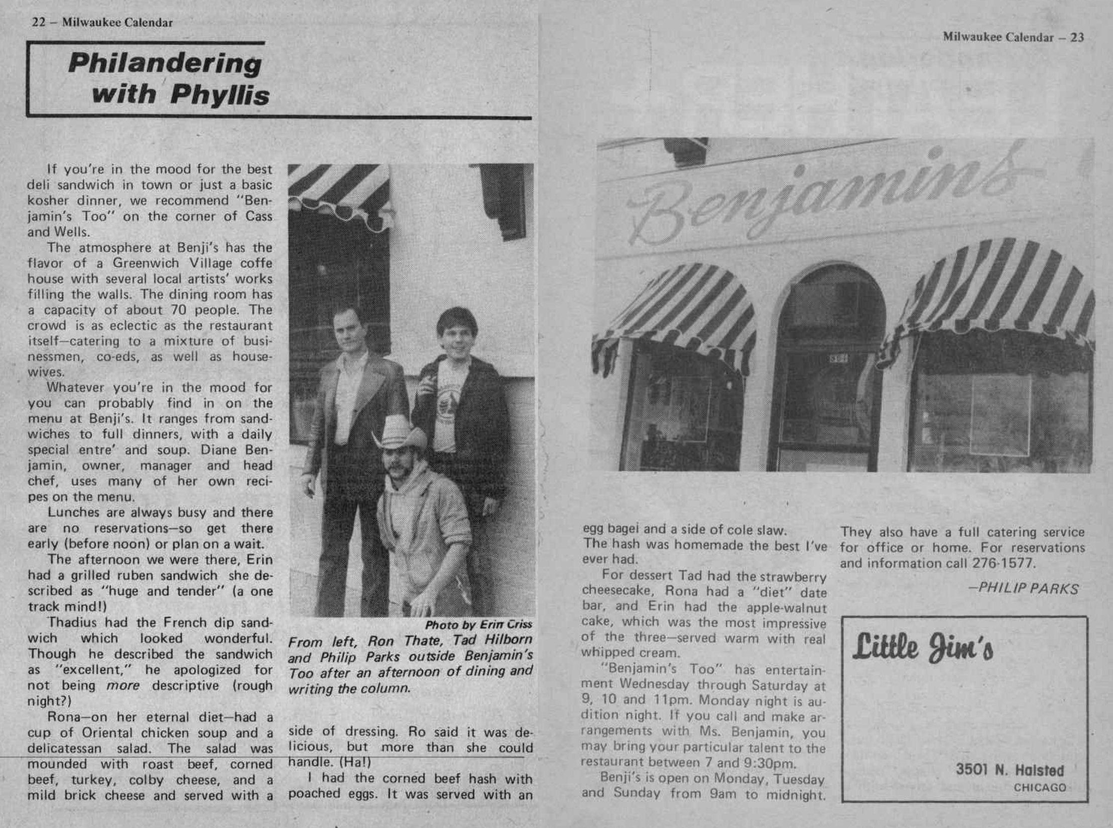 Rona participates in dining reviews at two restaurants: Prologue and Benjamin's Too