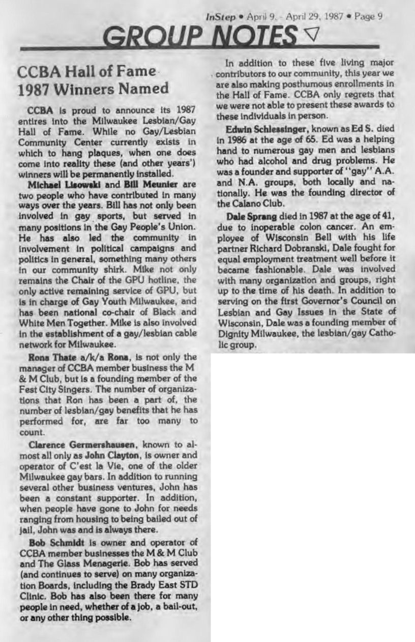 Group Notes column: Rona named as one of CCBA's 1987 annual Hall of Fame winners