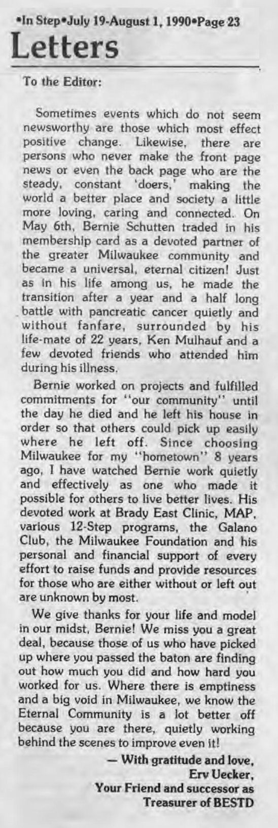 recognizing Bernie Schutten on his death