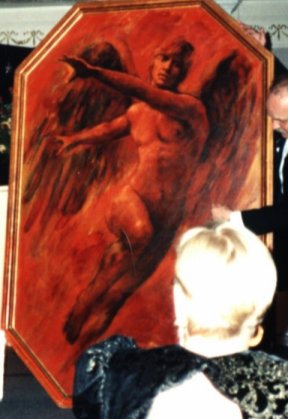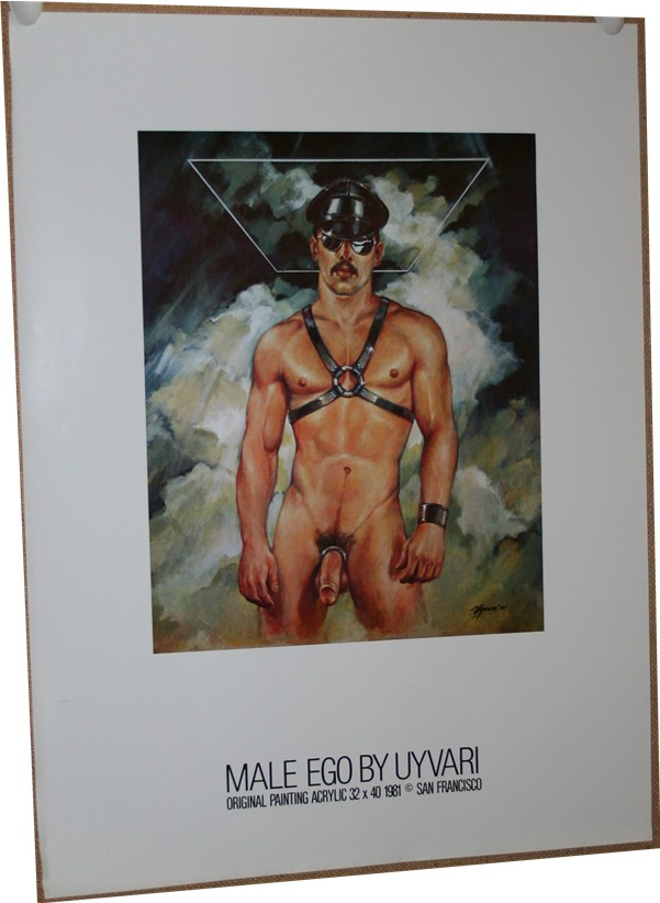 circa 1976 artwork typical of Uyvari's "Male Adult Angel" theme of the time (This painting is reputed to have hung for many years in the Y.P./ Your Place bar. It was still owned by the owner of the Ballgame gay bar until 2010, when it was sold to a private collector)
